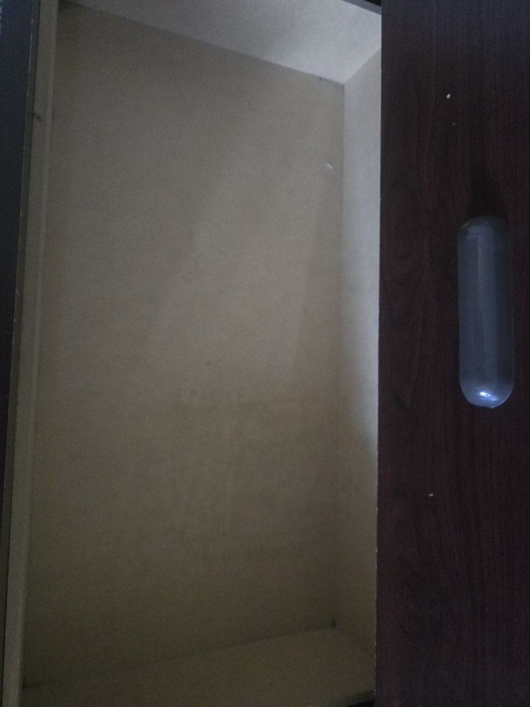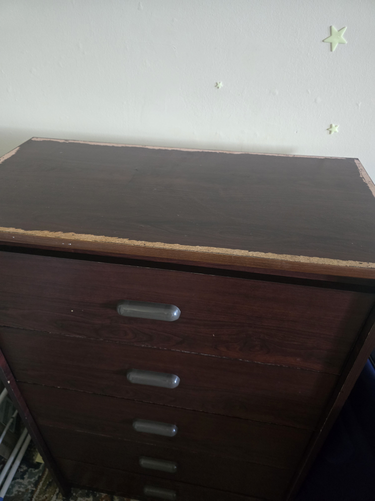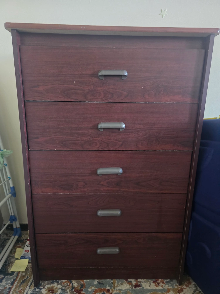 Dark brown wooden chest of drawers. Five drawers, grey handles. Minor wear and tear visible. Solid wood construction. Good for bedroom storage.