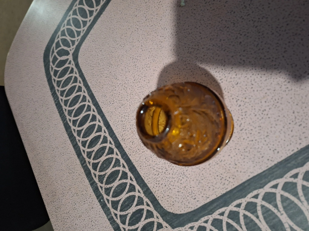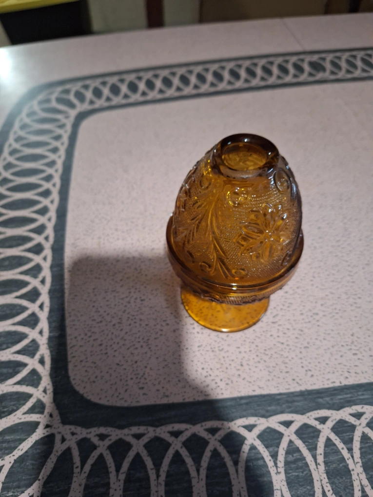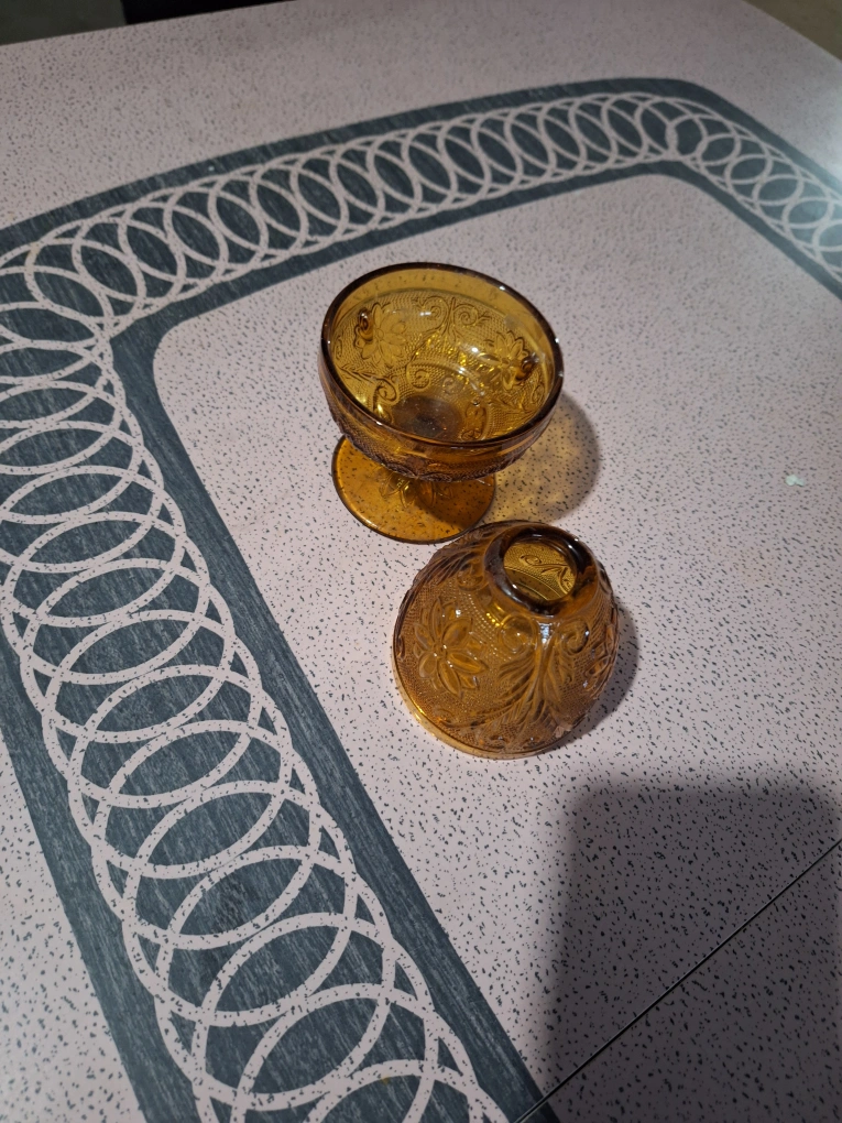 Beautiful amber glass candle holder. Intricate detailing. Two pieces. Perfect for adding a touch of vintage charm to your home decor. Great for candles or votives.