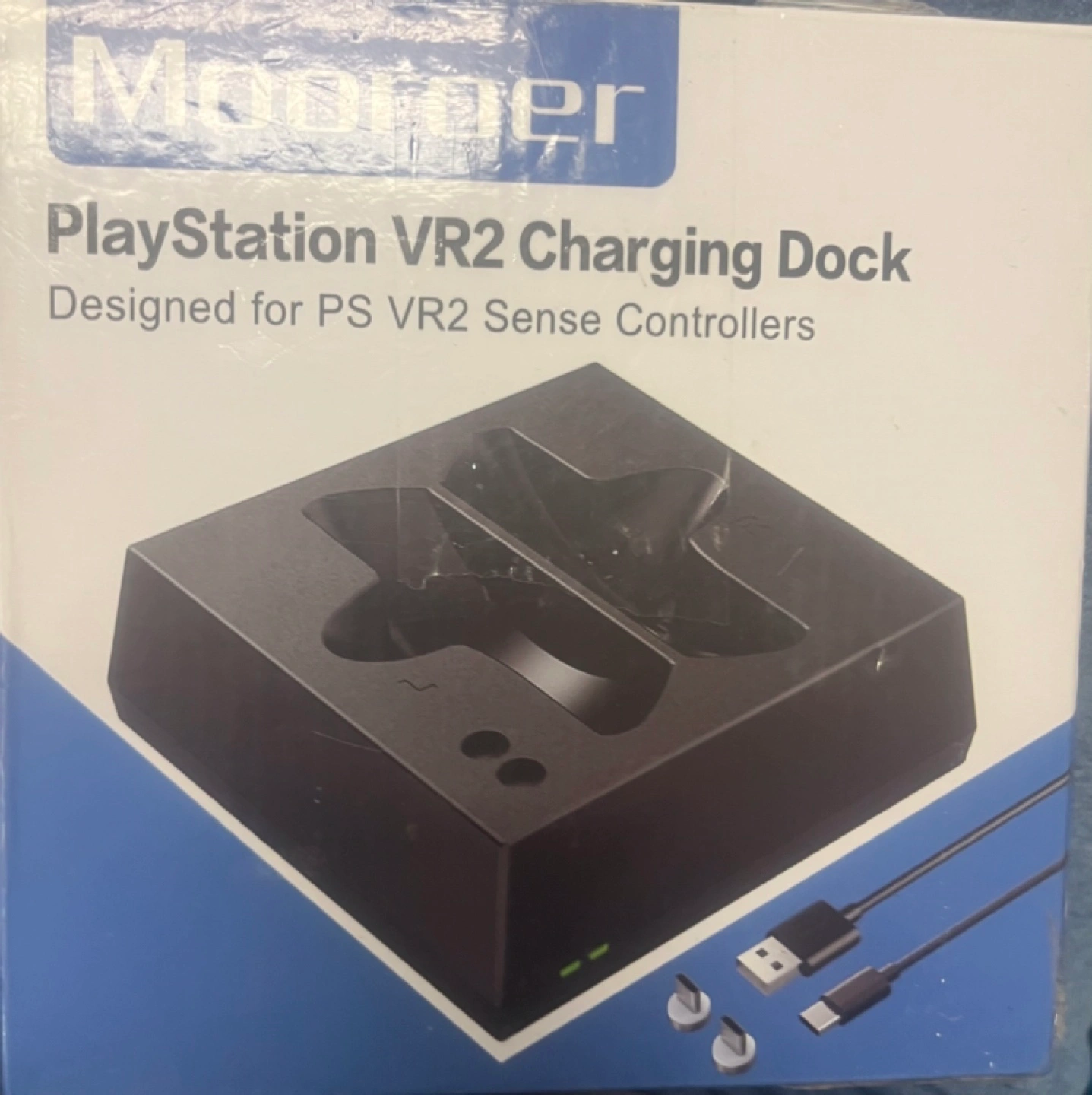 New PlayStation VR2 charging dock. Designed for PS VR2 Sense controllers. Includes USB-A to USB-C cable and charging caps.
