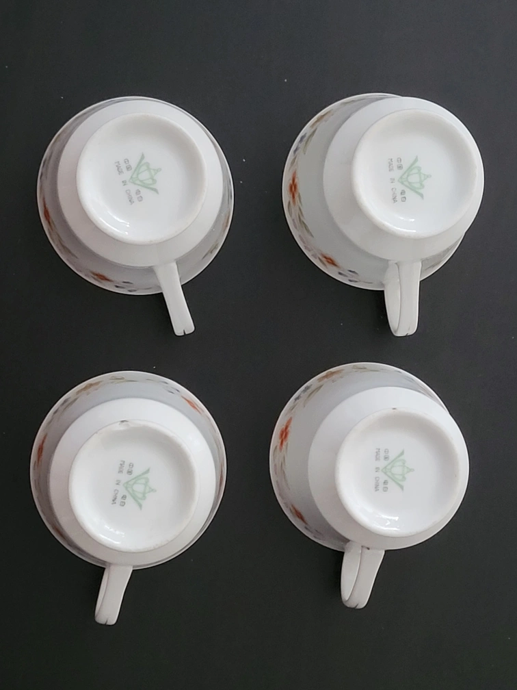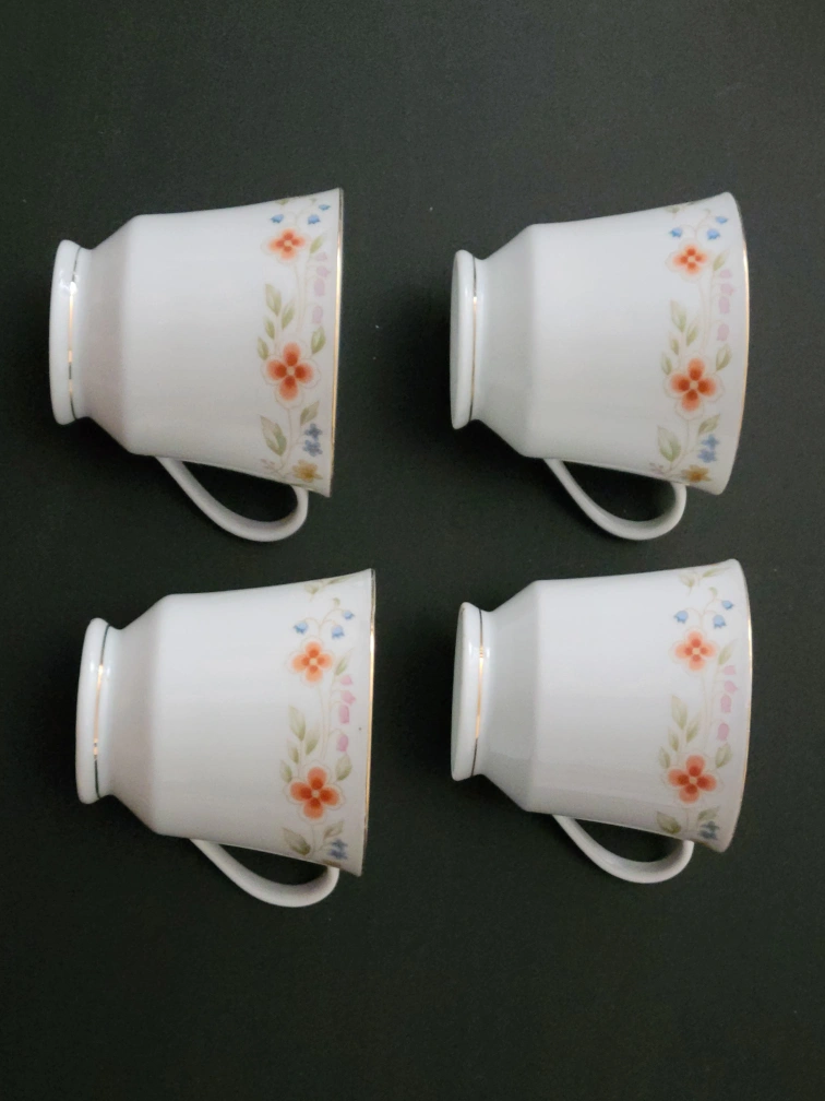 Set of four vintage teacups. Floral pattern. Made in China. Gold trim. Great for tea parties or everyday use.