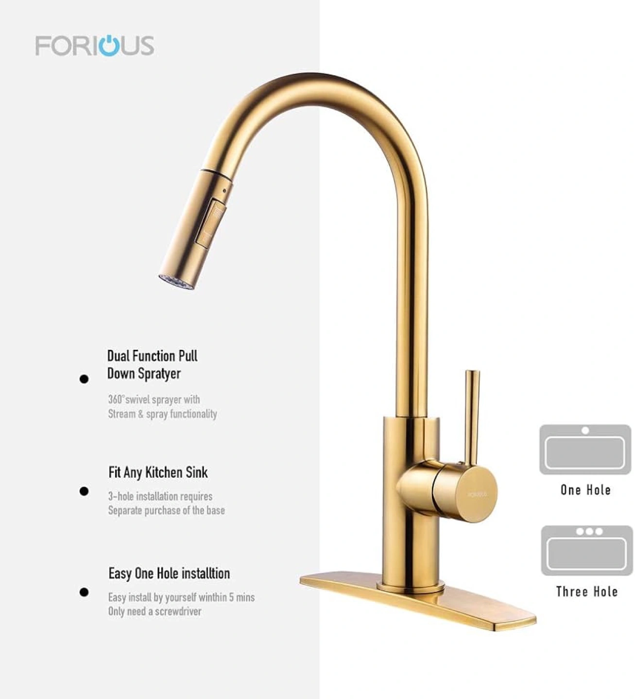 FORIOUS Brushed Gold Kitchen Faucet with Pull-Down Sprayer