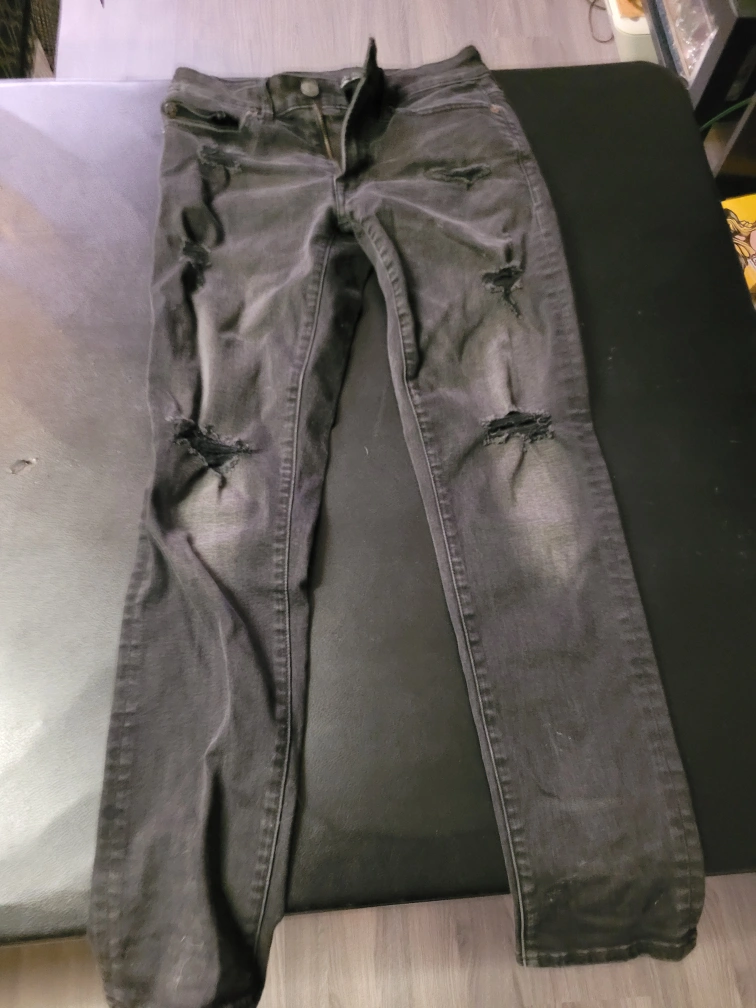 Black distressed jeggings. Size 26 x 28. 92% cotton, 6% polyester, 2% elastane. Some wear and tear.
