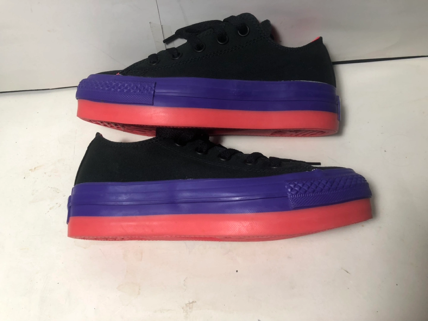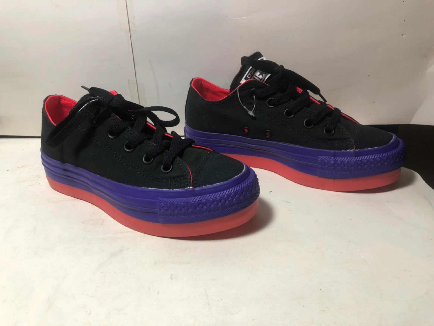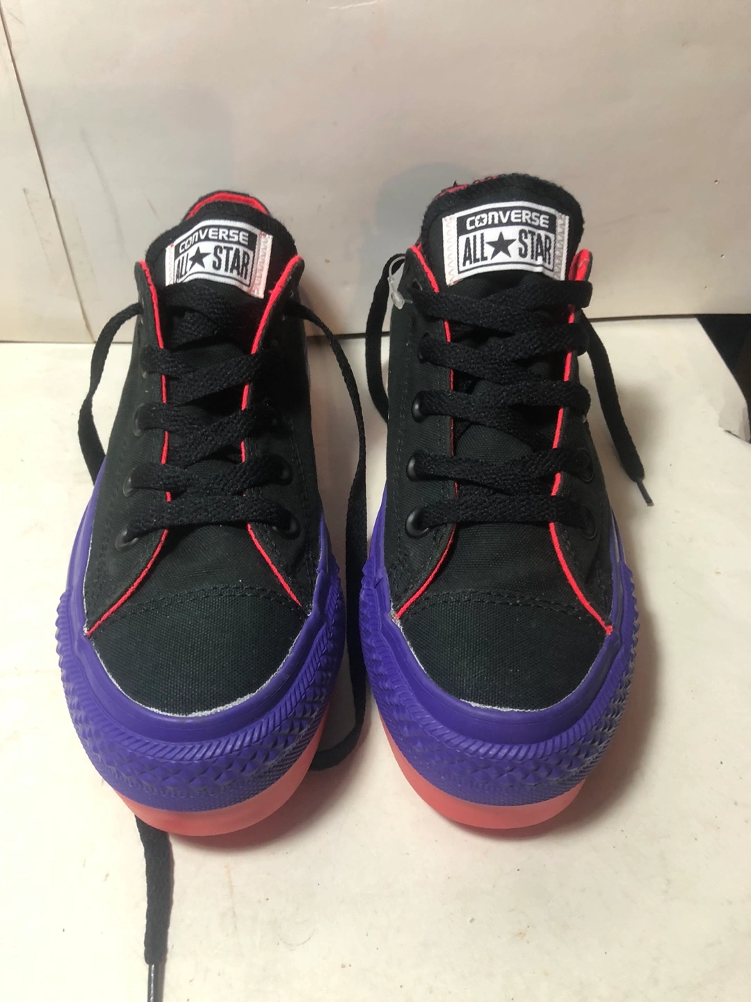 Women's Converse All Star Chuck Taylor platform sneakers. Black canvas upper, purple and red platform sole. Lace-up closure. Size is a Woman’s 3-1/2 , These Platform Sneakers Will Add 1-1/2 inches to your Height