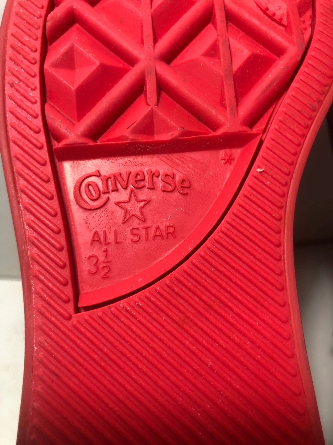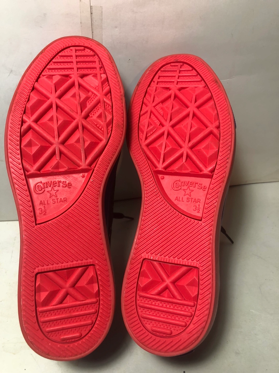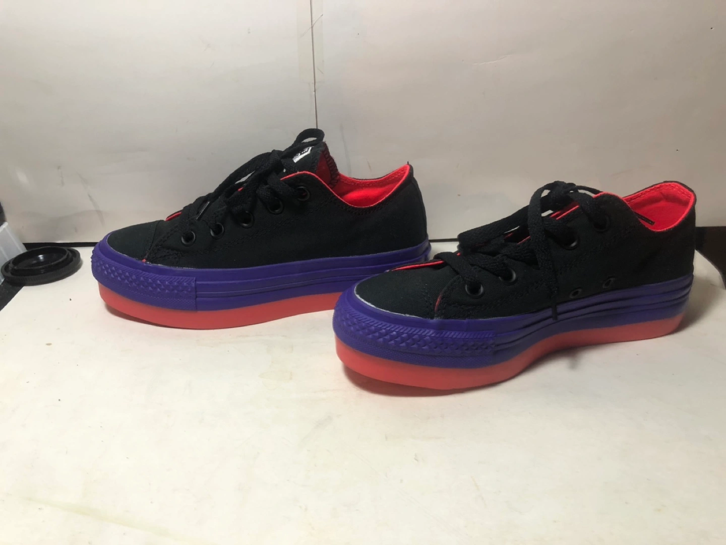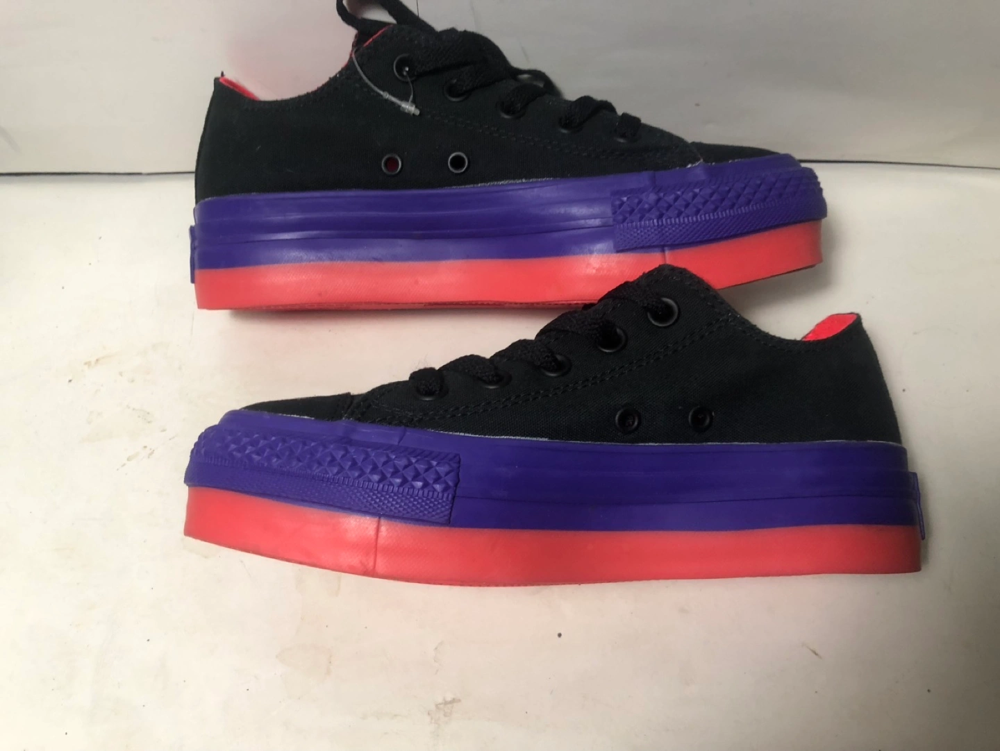 Women's Converse All Star Chuck Taylor platform sneakers. Black canvas upper, purple and red platform sole. Lace-up closure. Size is a Woman’s 3-1/2 , These Platform Sneakers Will Add 1-1/2 inches to your Height