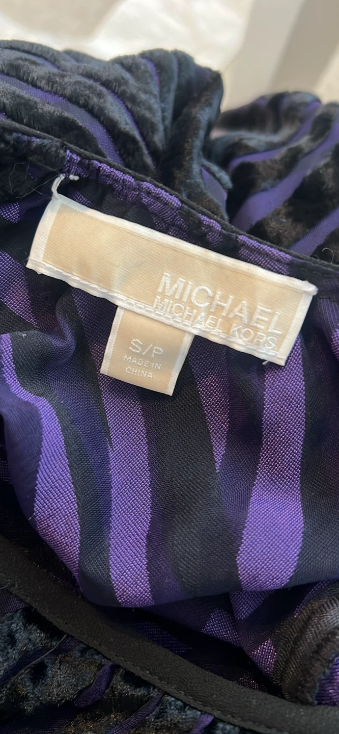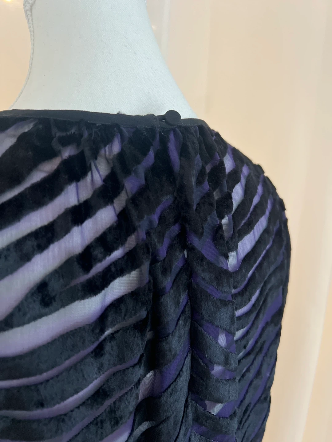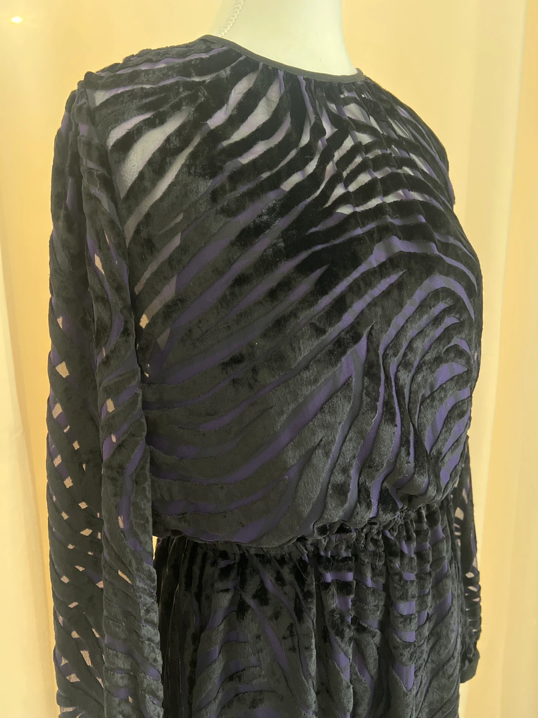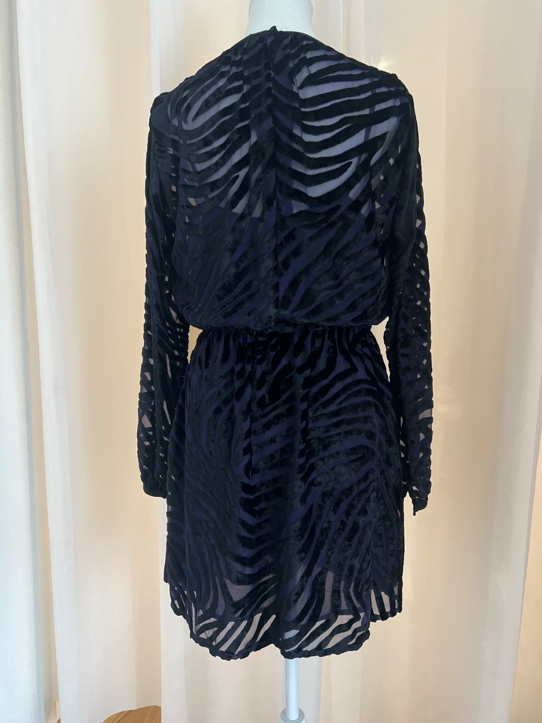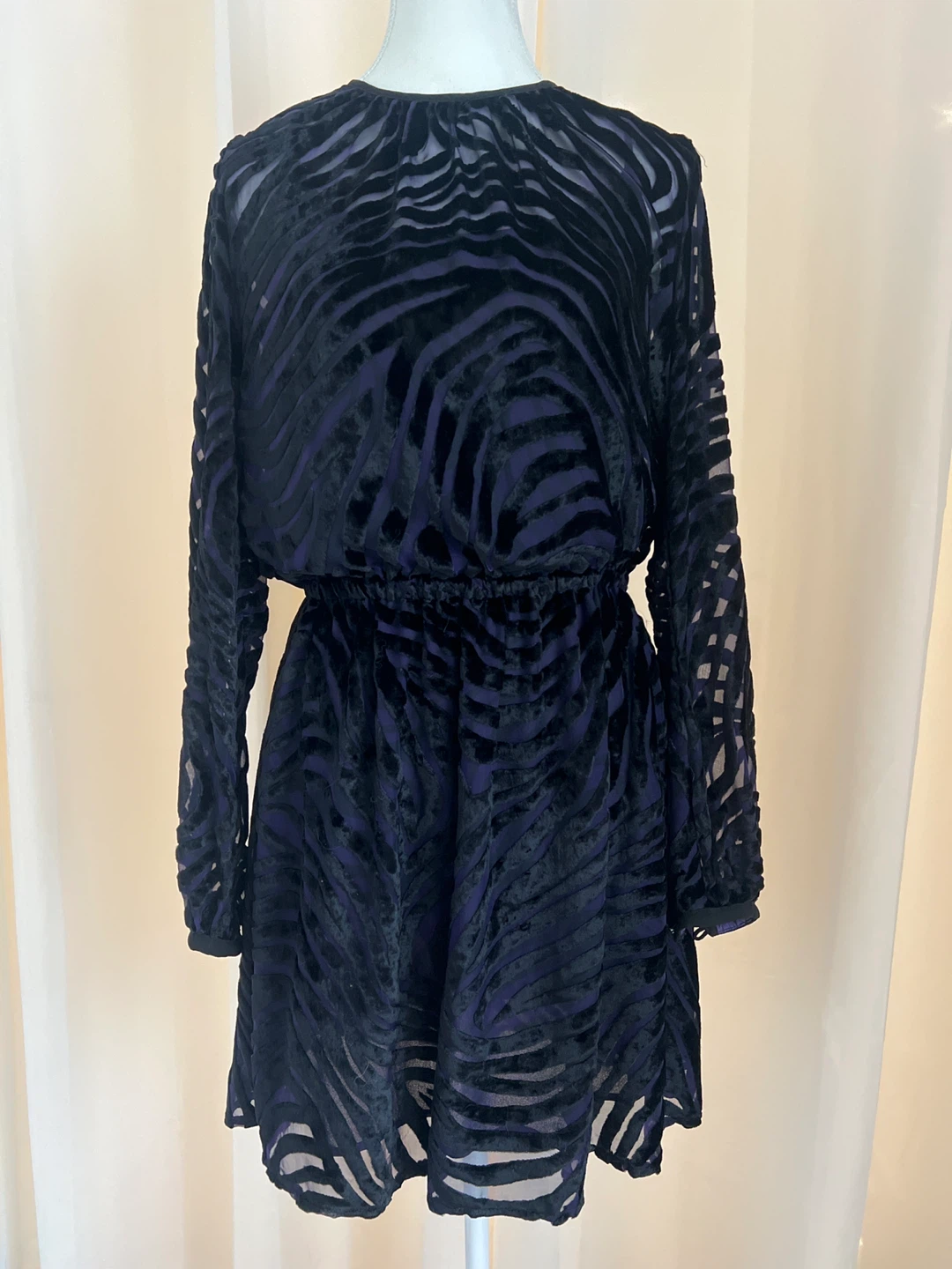 Stunning mini dress. Features a zebra print velvet overlay on sheer fabric. Long sleeves. Elastic waistband. Size Small/Medium