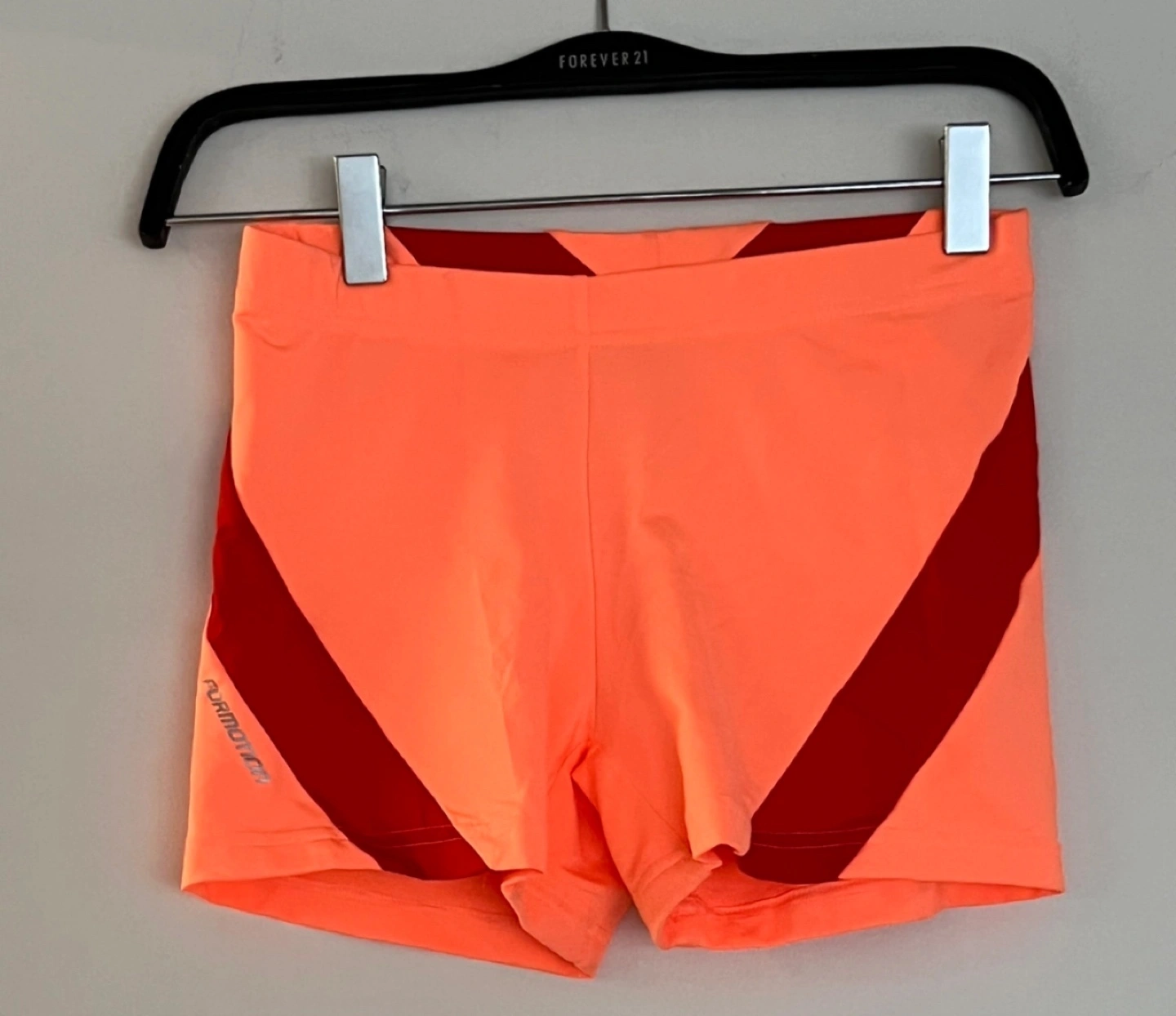Women's athletic shorts. Bright coral colour with red accents. Lightweight and stretchy fabric. Perfect for workouts or casual wear.