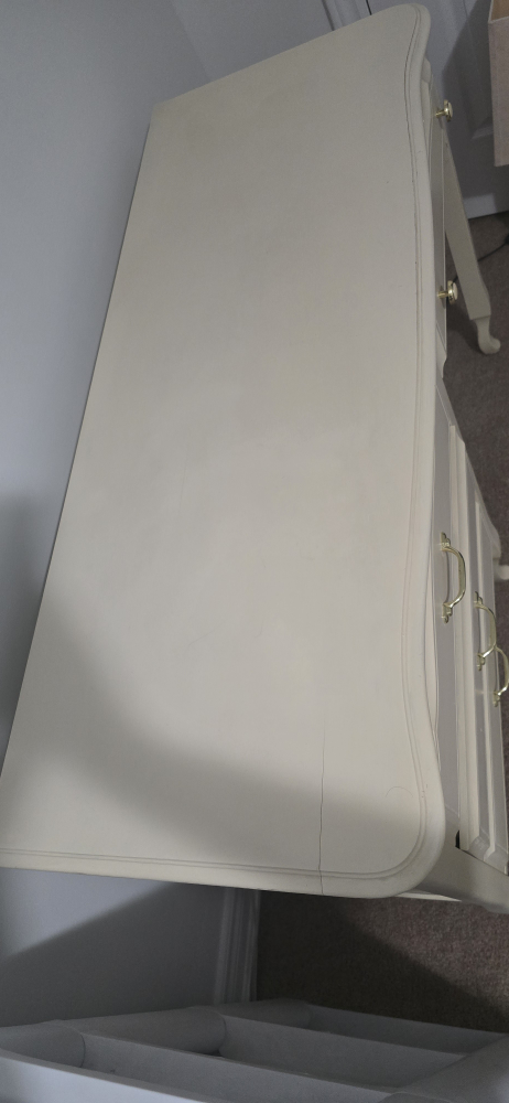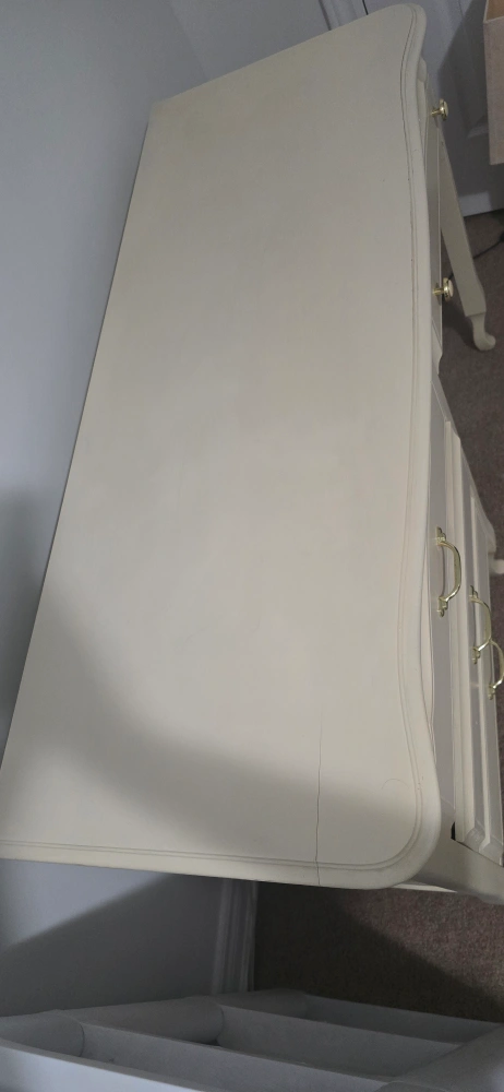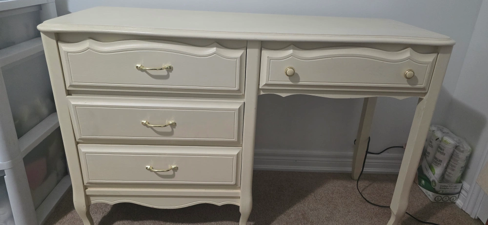 A cream-colored vanity desk with four drawers and a writing surface. A matching mirror is also available.