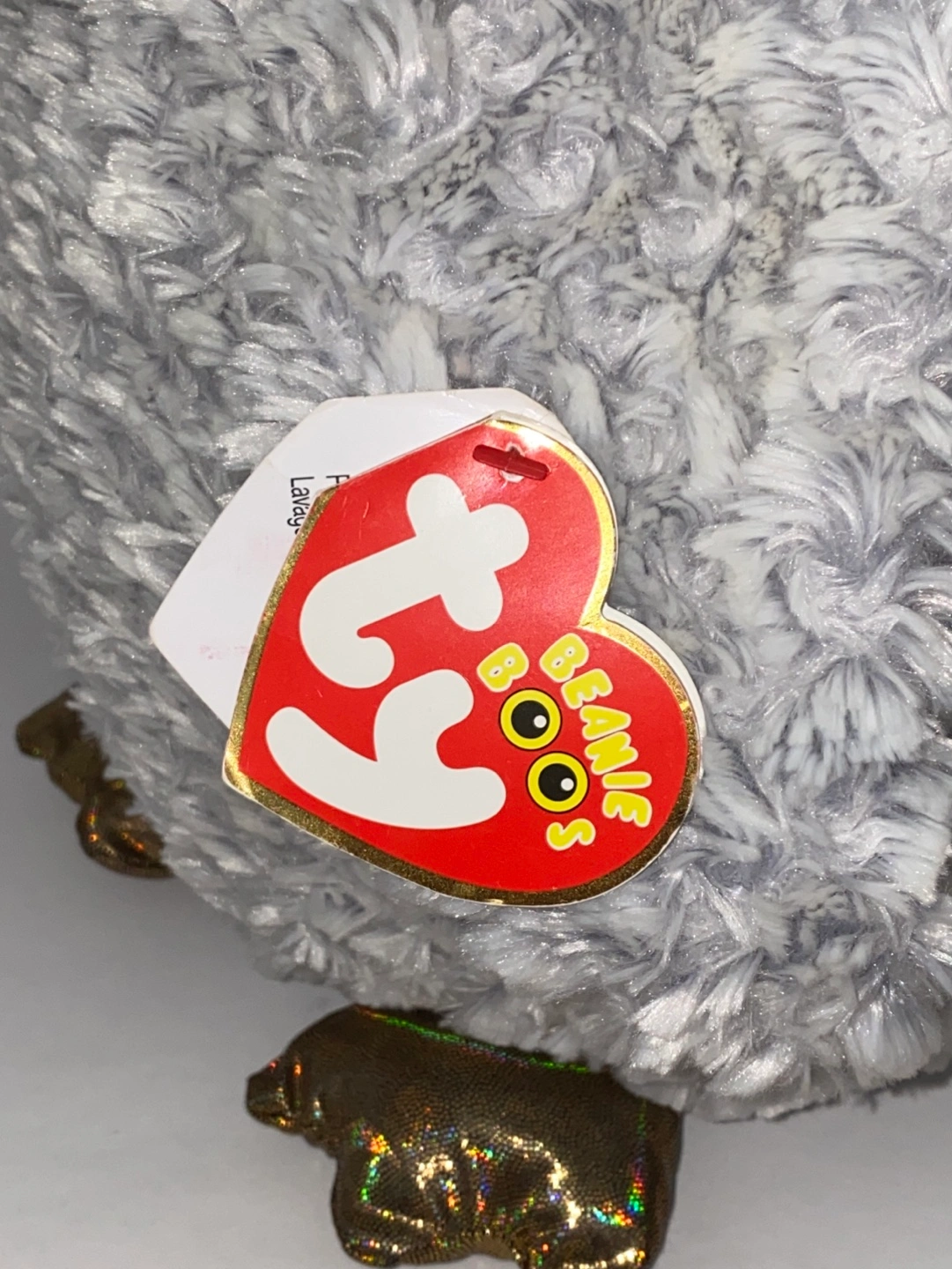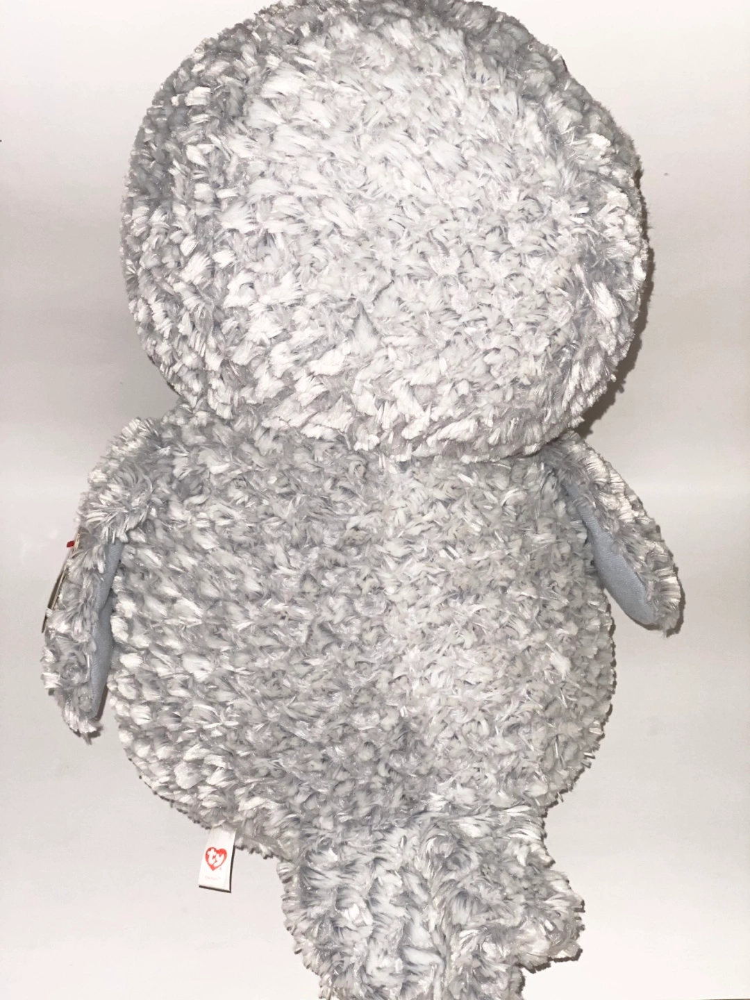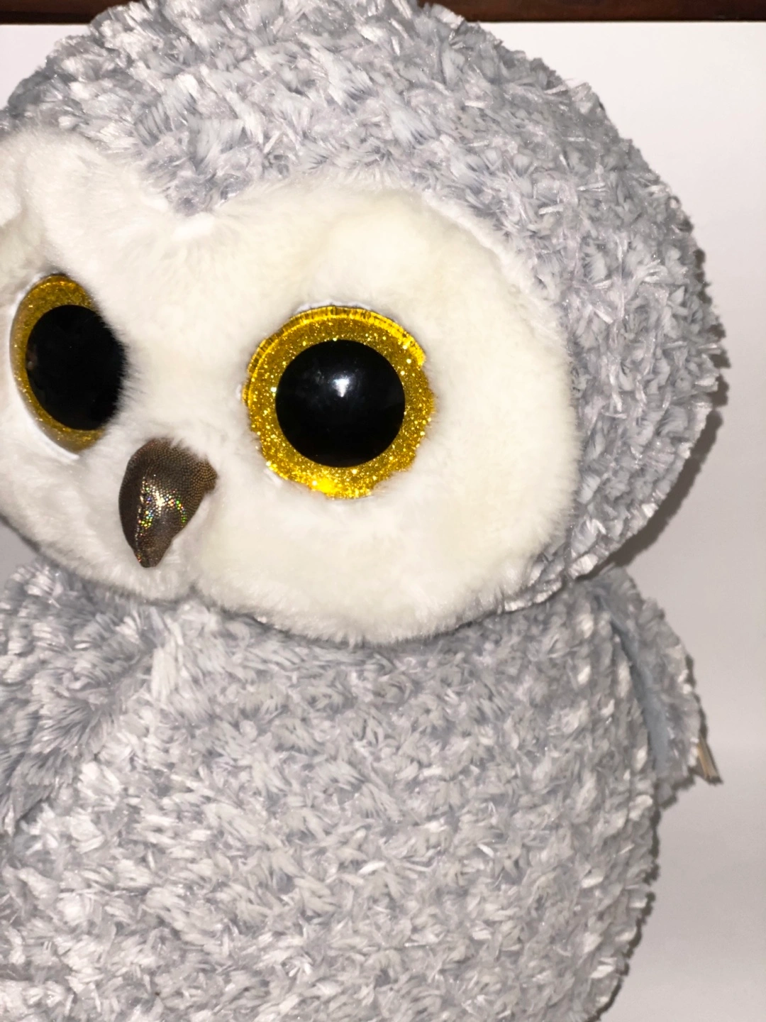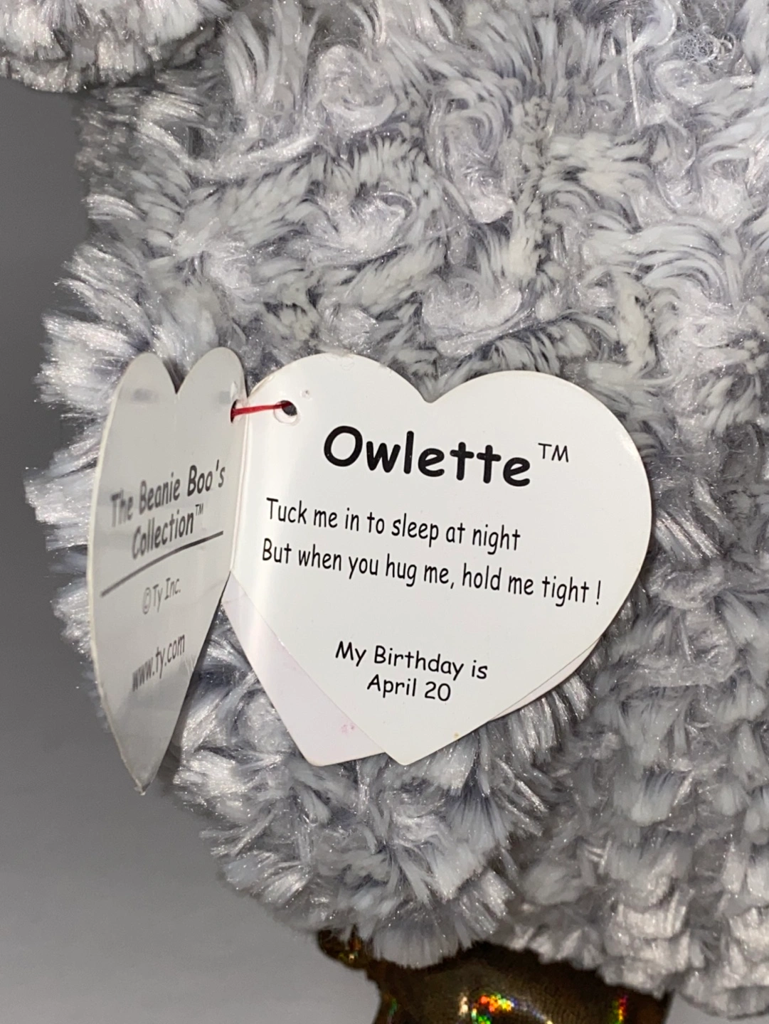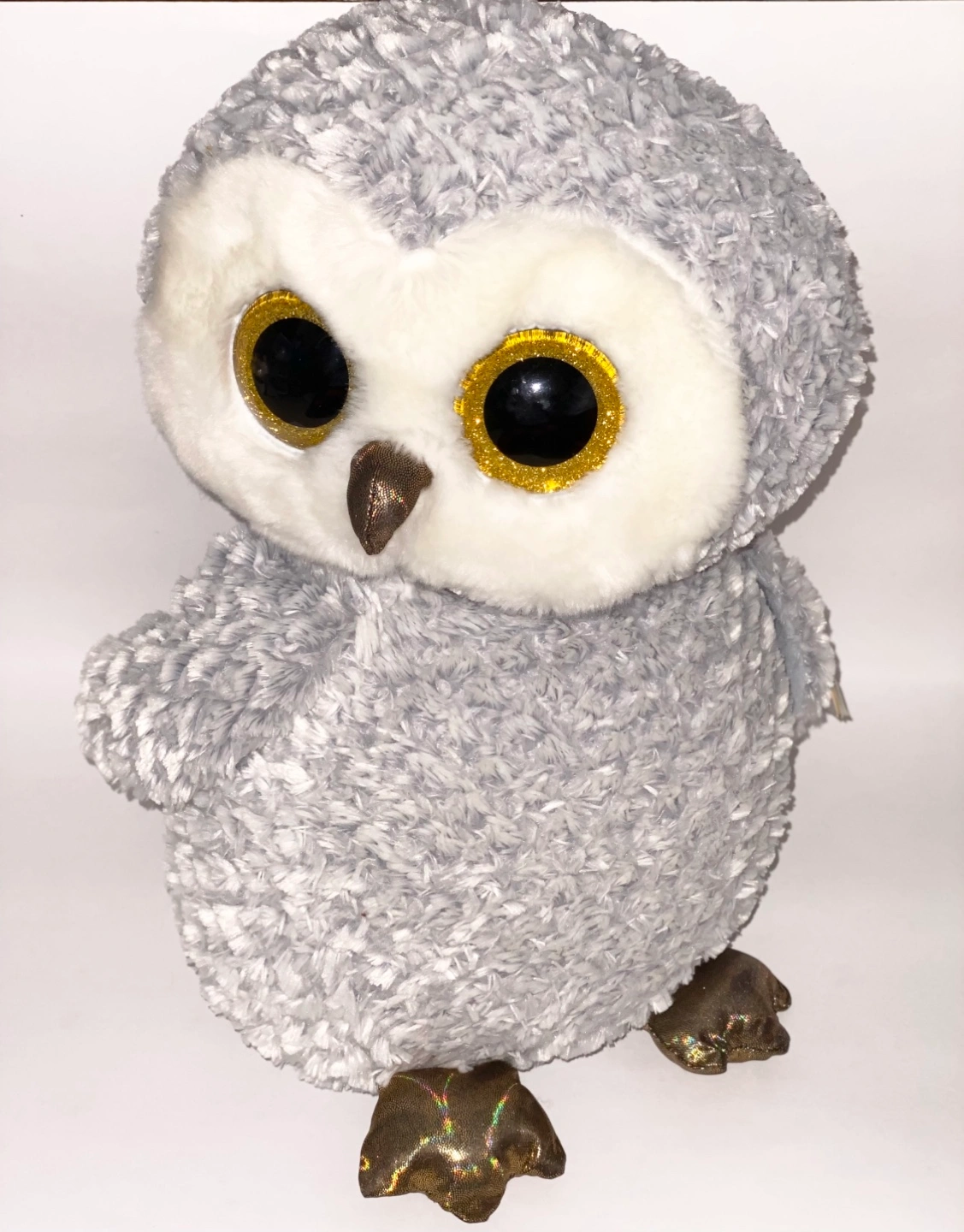 Grey and white plush owl. Large, sparkly eyes. Gold accents on feet and beak. Soft, fluffy fur. Ty heart-shaped tag attached. Measures at 16” in height.