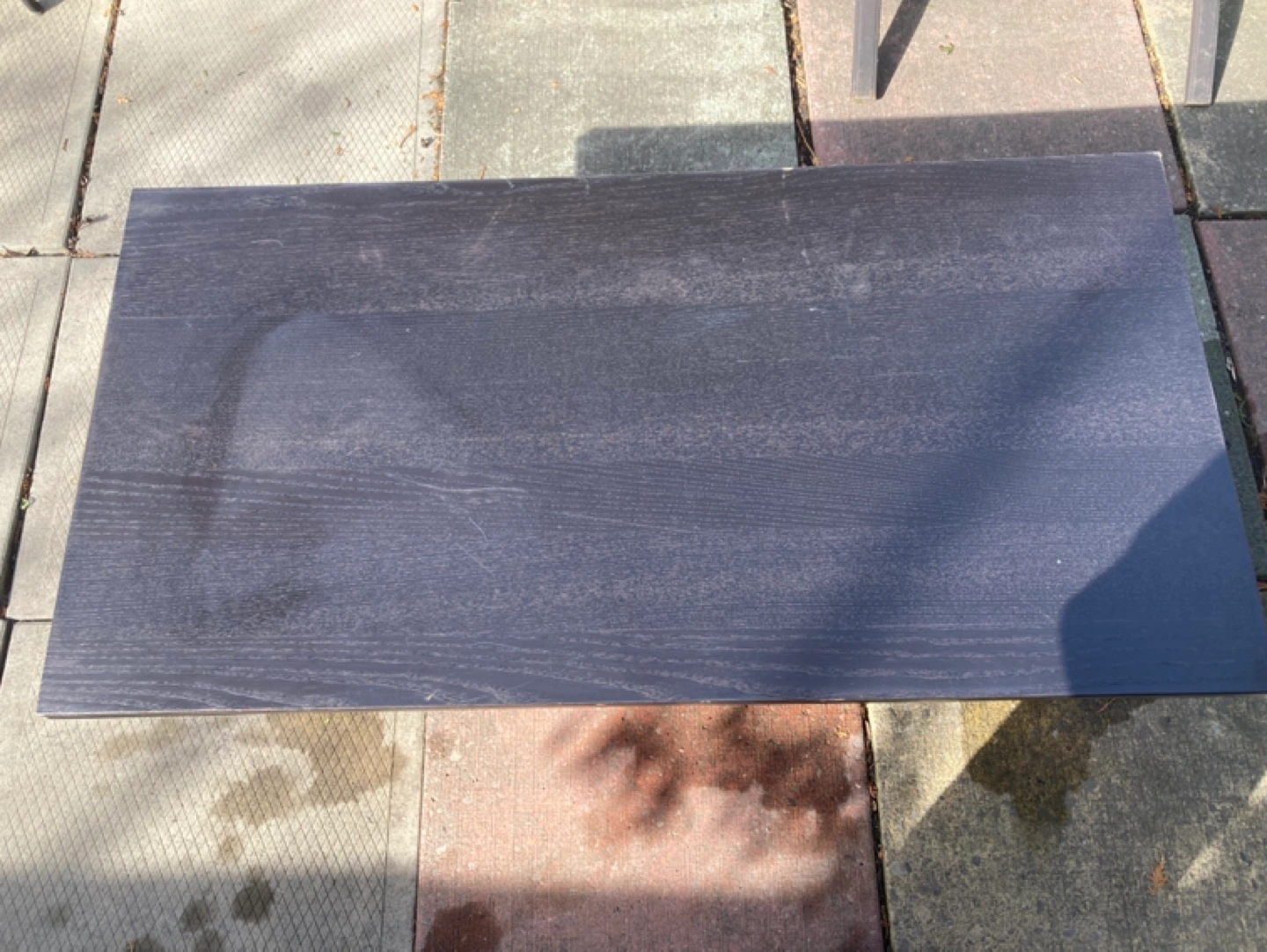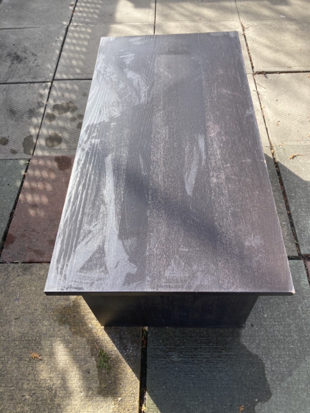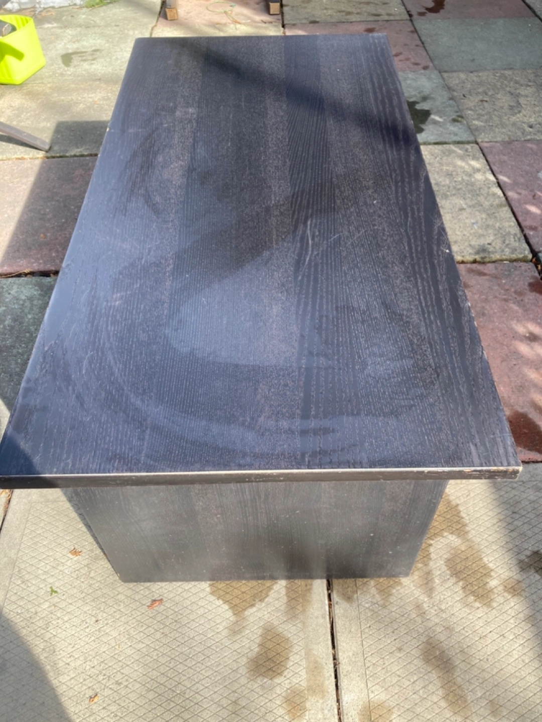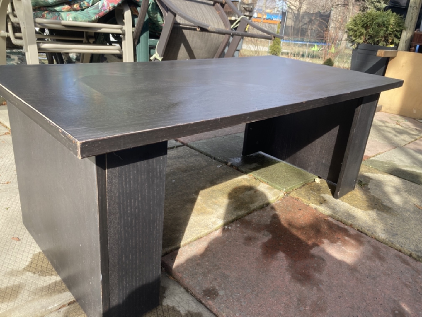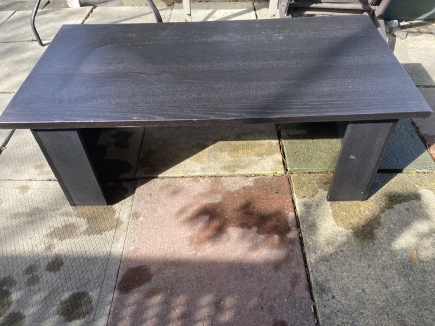 Small, dark brown coffee table. Simple design, rectangular shape. Some minor wear and tear visible on the surface. Good for a small space. A bit heavy and sturdy.
