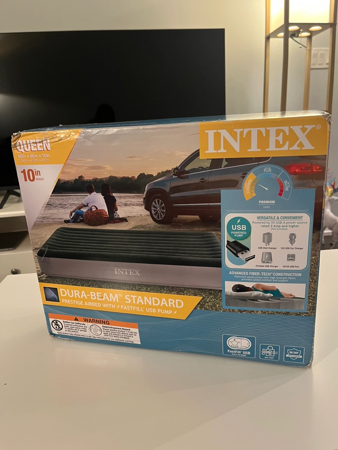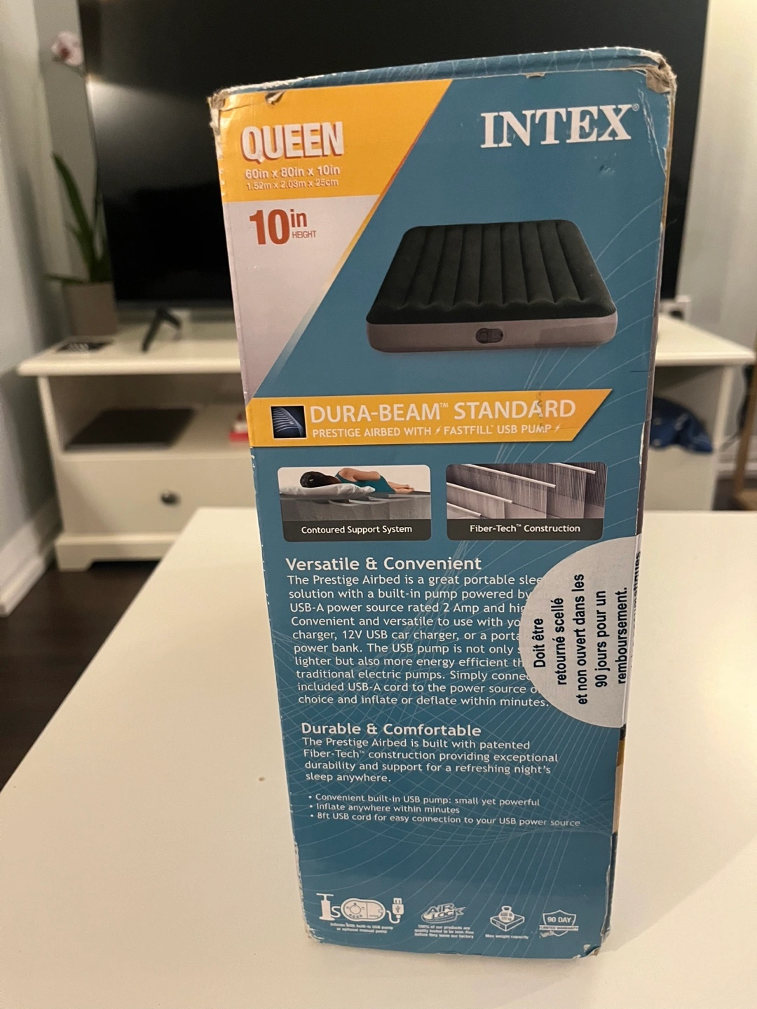 Queen-sized inflatable air mattress. 10-inch height. USB powered pump. Durable and comfortable. Folds for easy storage. Barely used once. Pickup in North York, Sheppard and Victoria Park