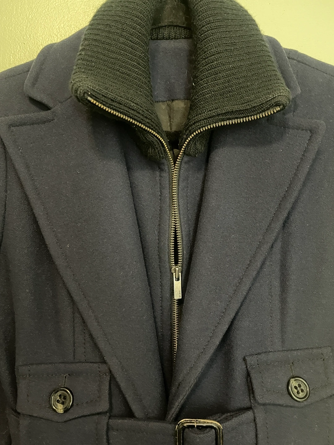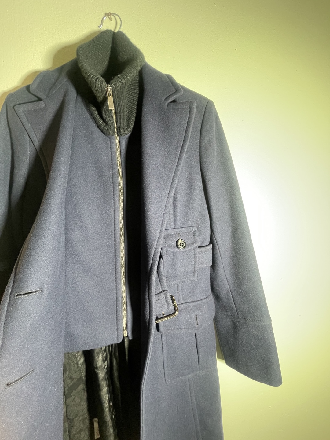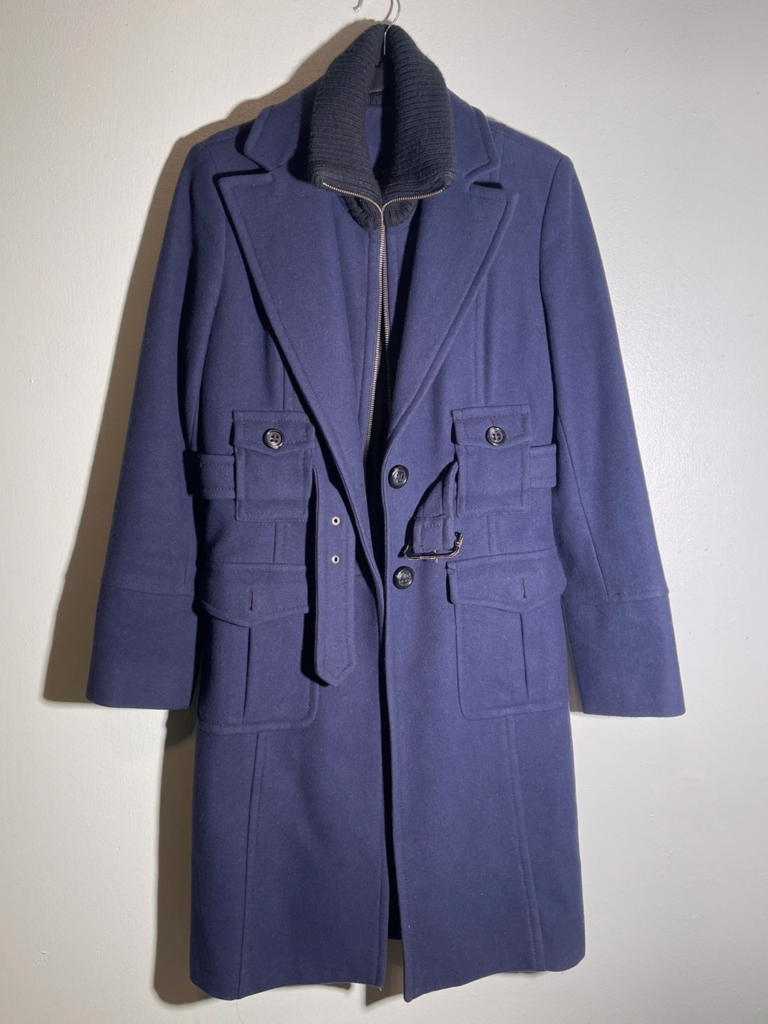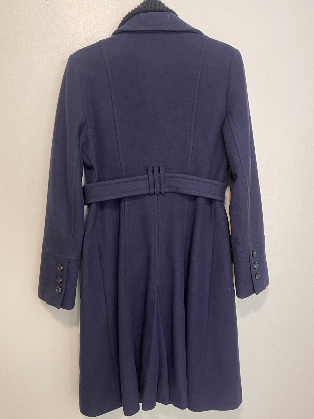 BCBG WOOL Women's navy blue peacoat. Features a belted waist, multiple pockets, and a detachable black collar. Zip and button closure. Excellent for colder weather.
