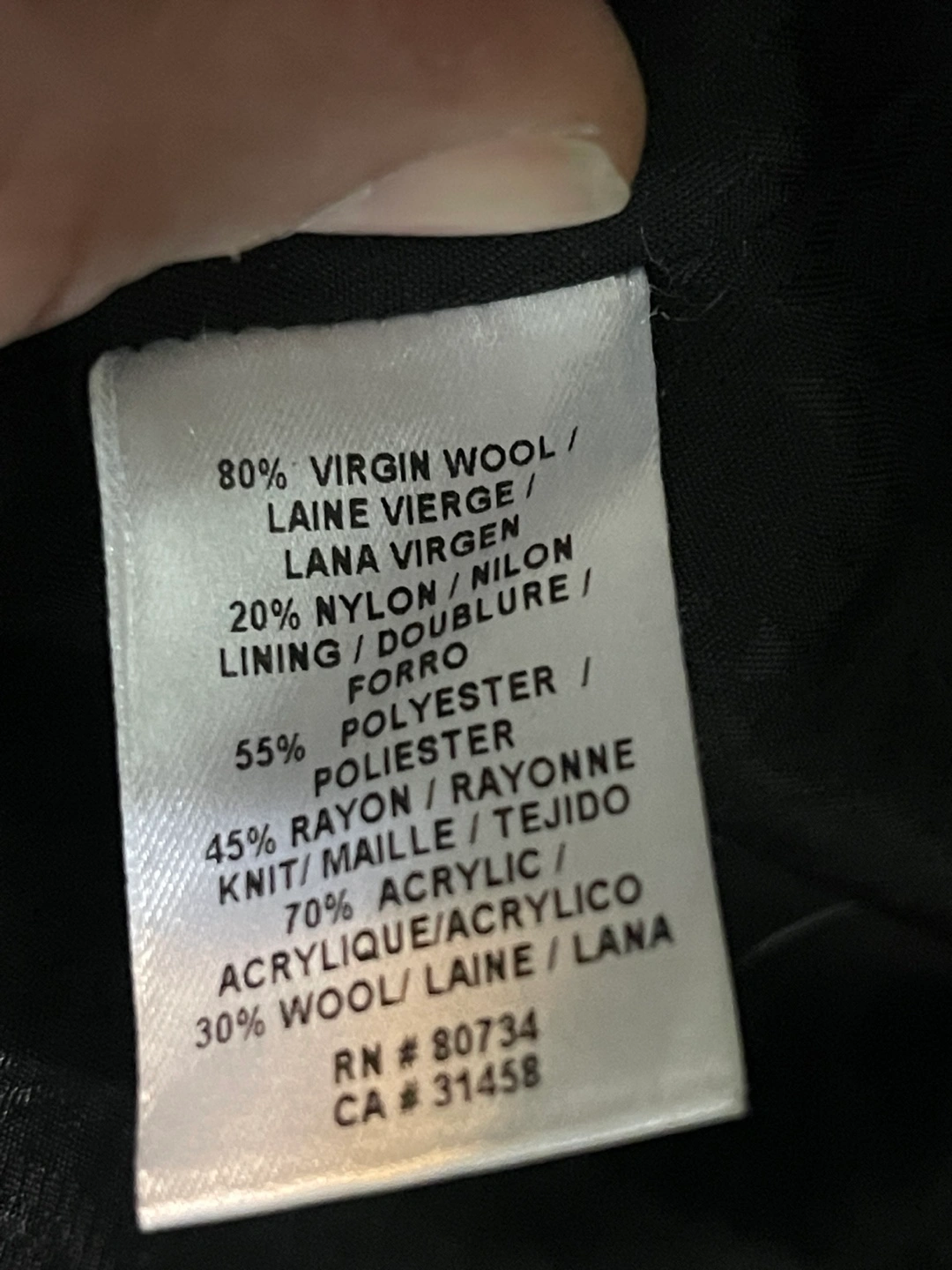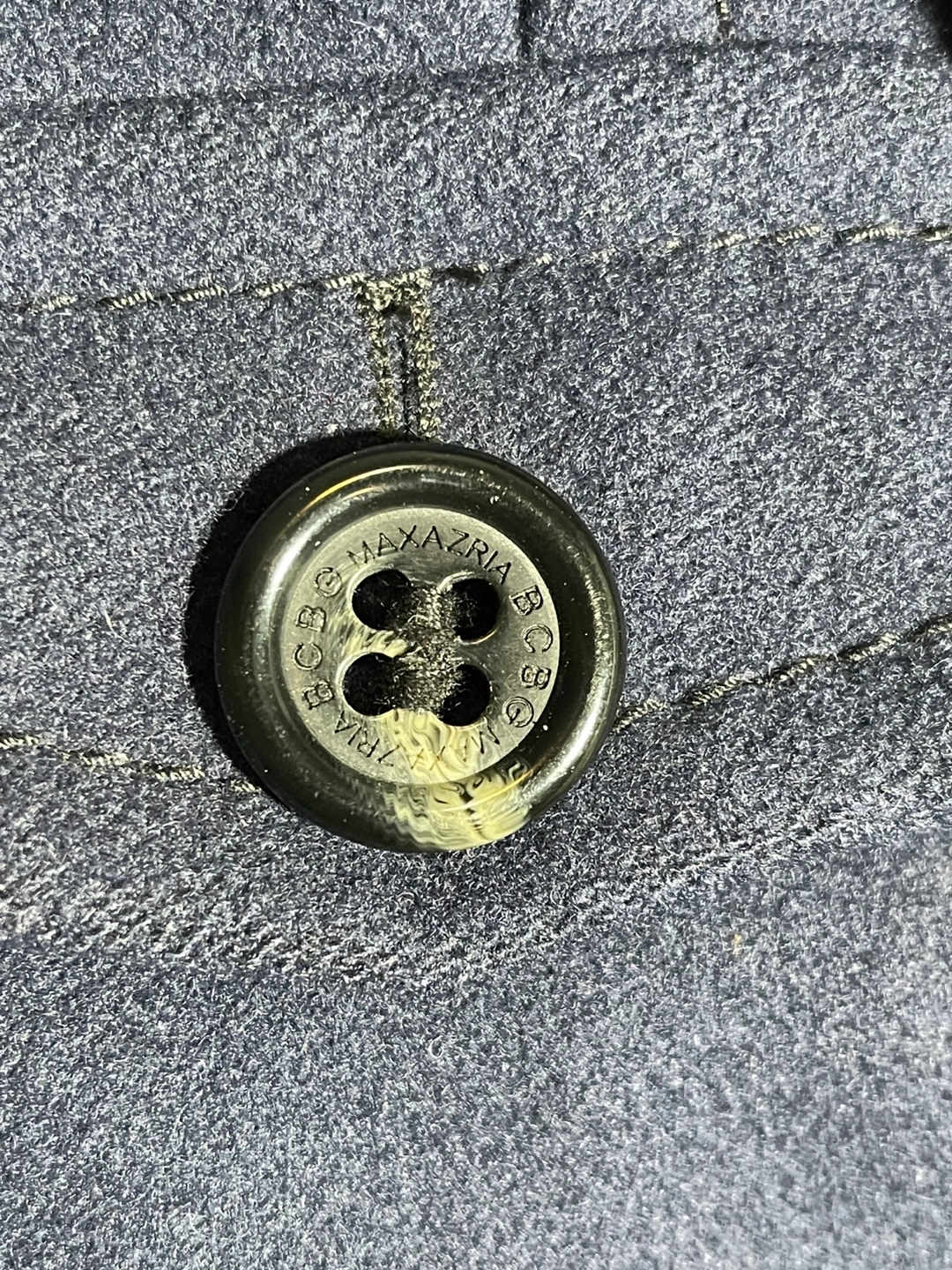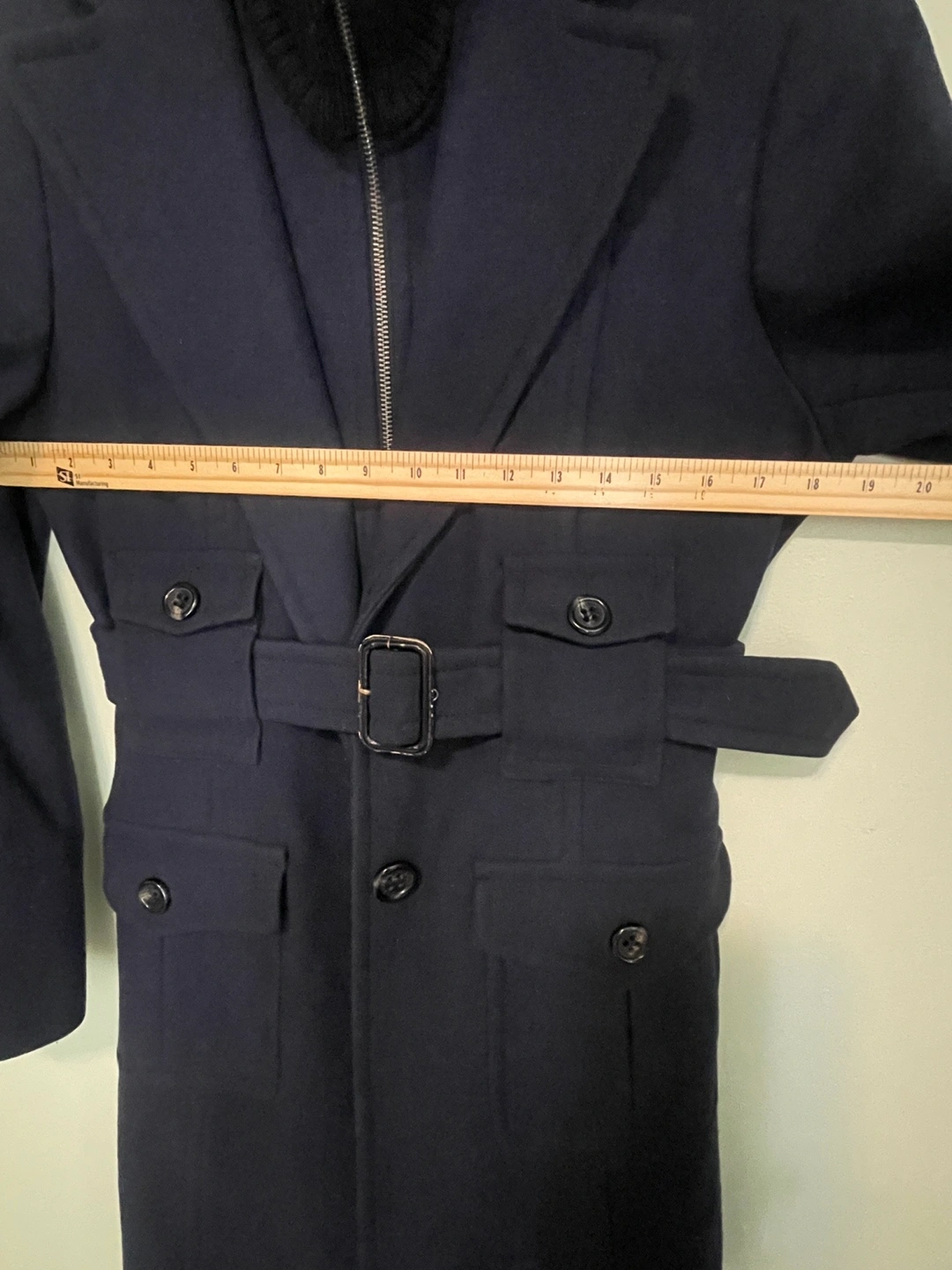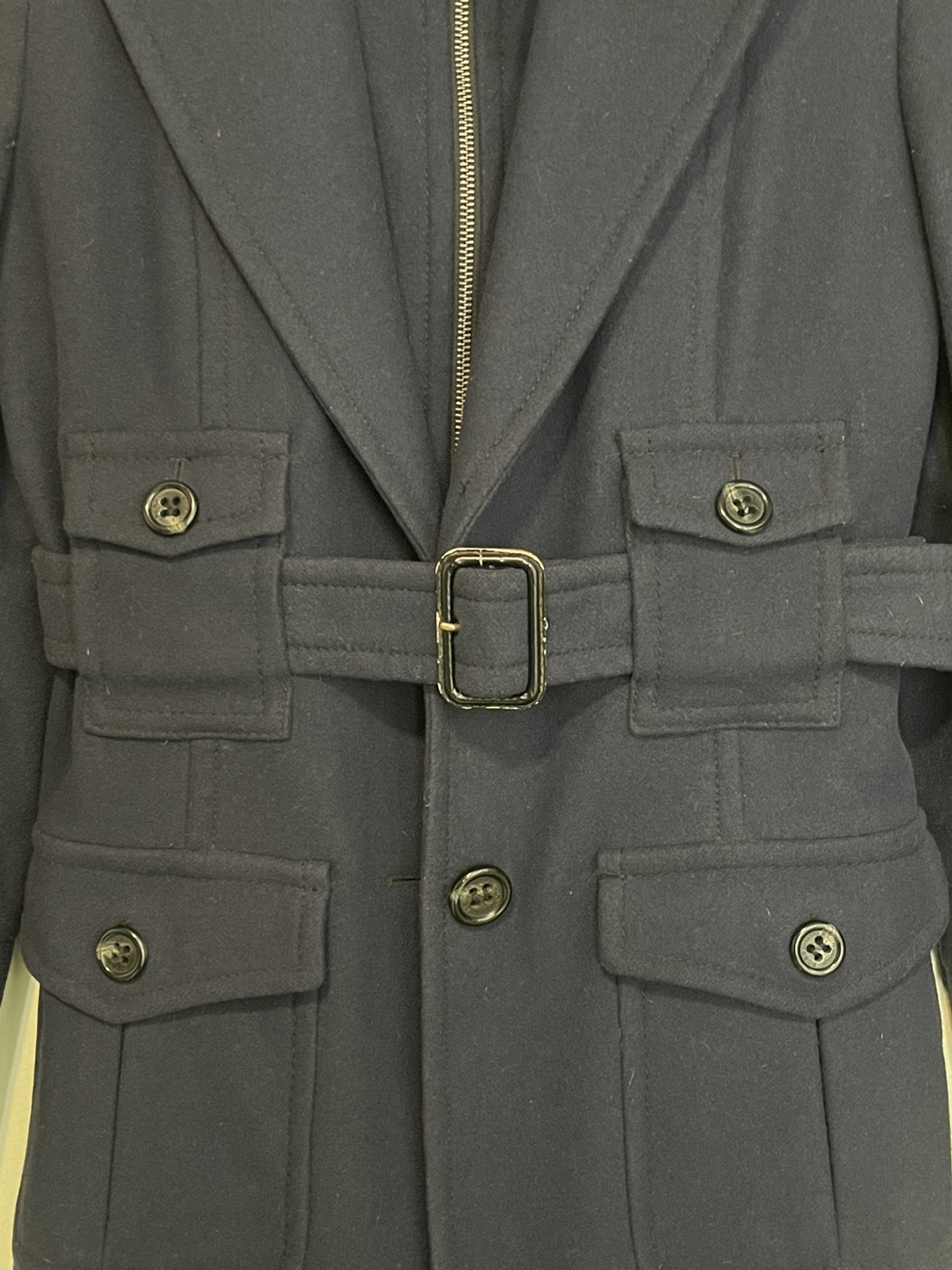 BCBG WOOL Women's navy blue peacoat. Features a belted waist, multiple pockets, and a detachable black collar. Zip and button closure. Excellent for colder weather.