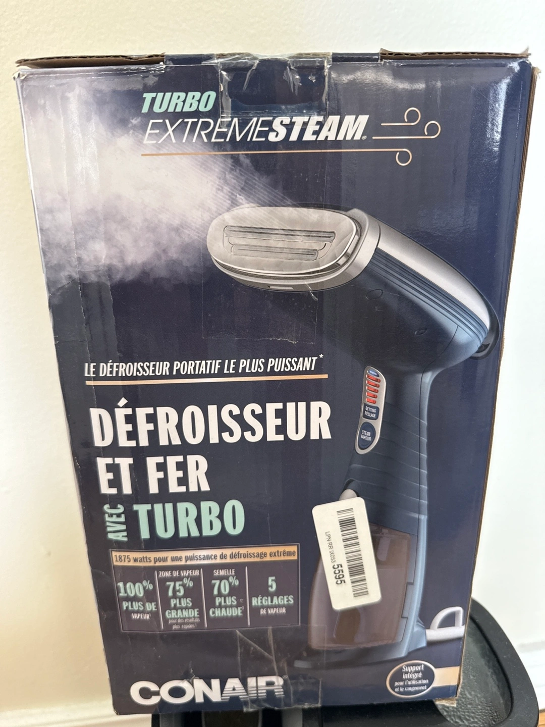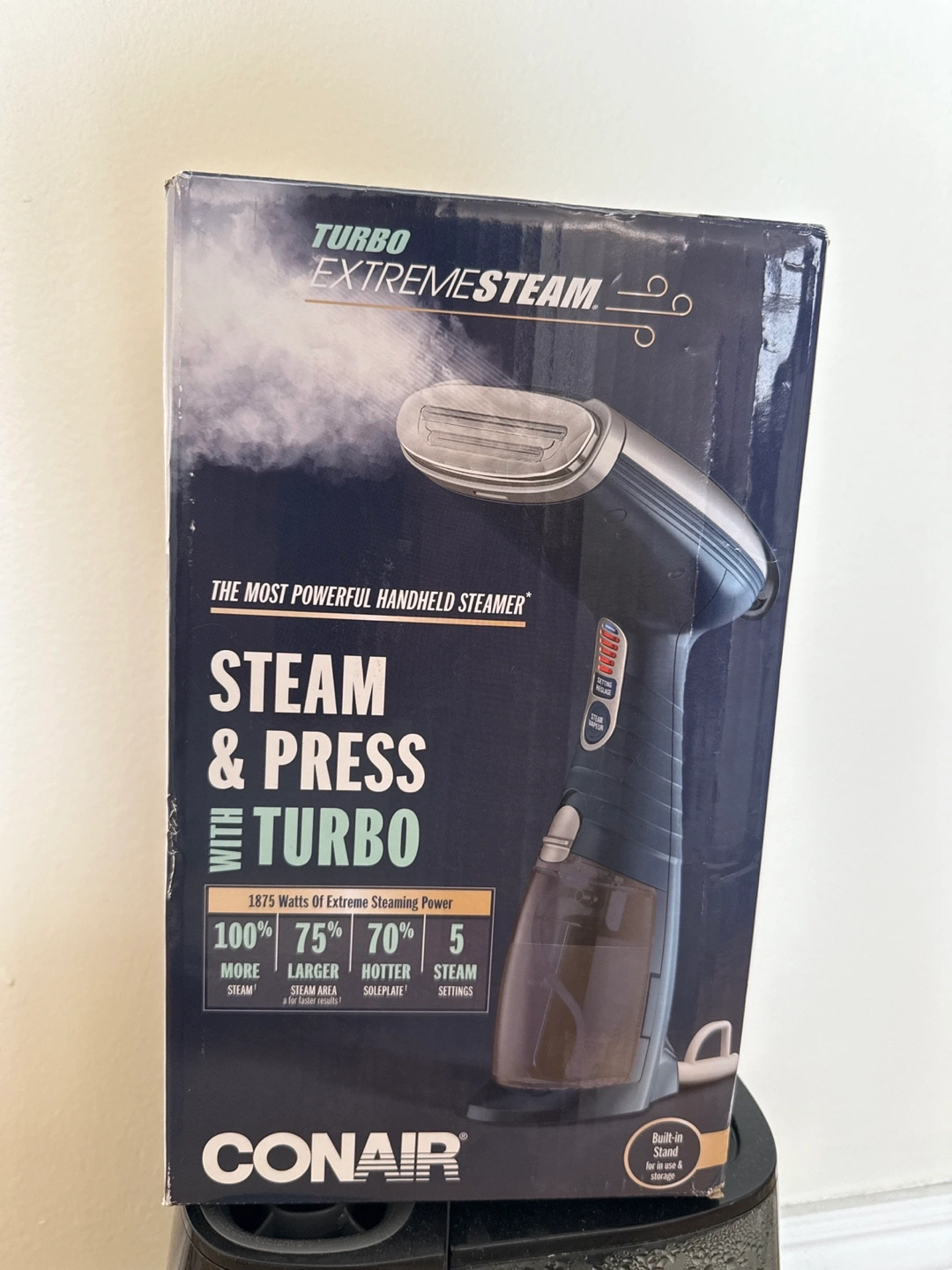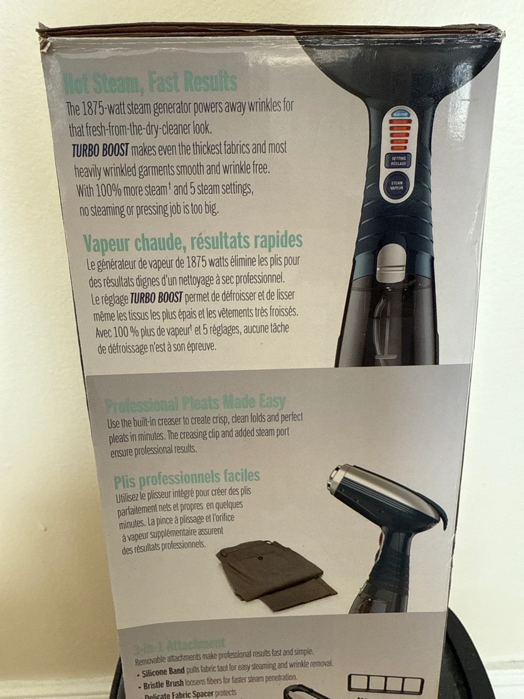 Powerful handheld garment steamer. Features 1875 watts, turbo boost, five steam settings, and multiple attachments. Great for removing wrinkles from most fabrics.