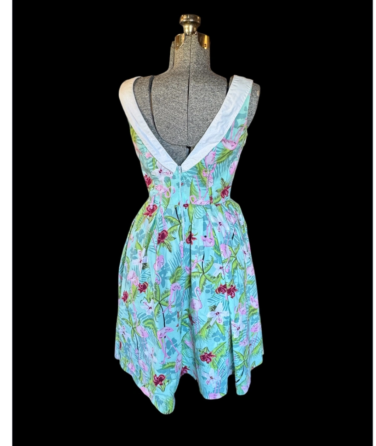 Adorable sleeveless fit and flare dress. Features a white collar, swing skirt, and concealed zip closure. Flamingo and tropical floral print on a teal background. Size small.