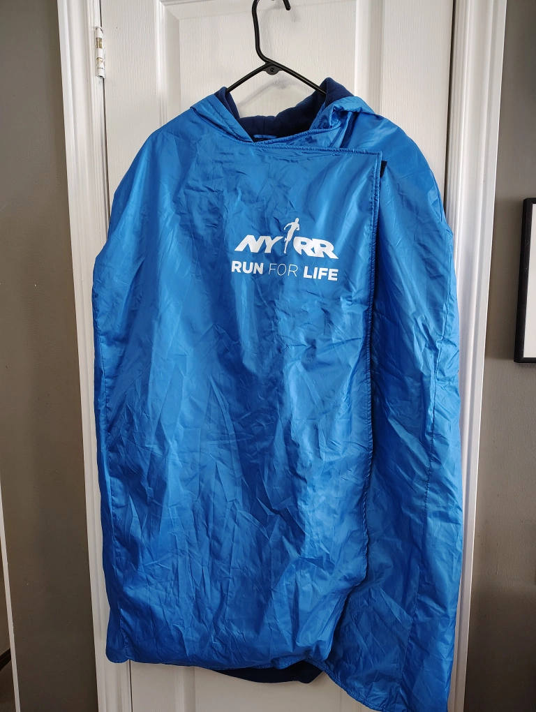 Blue nylon running poncho. Features a hood and is lightweight. Perfect for post-race warmth. Branded for the TCS New York City Marathon.