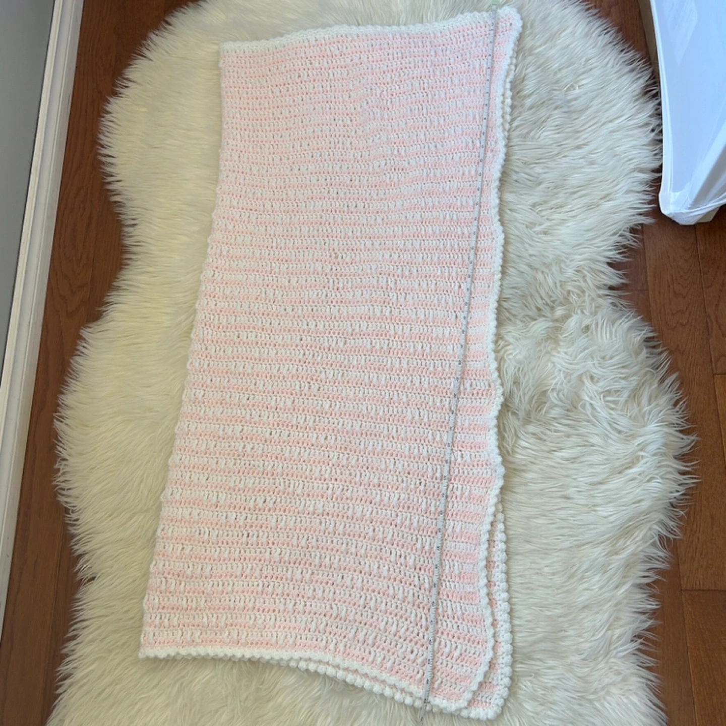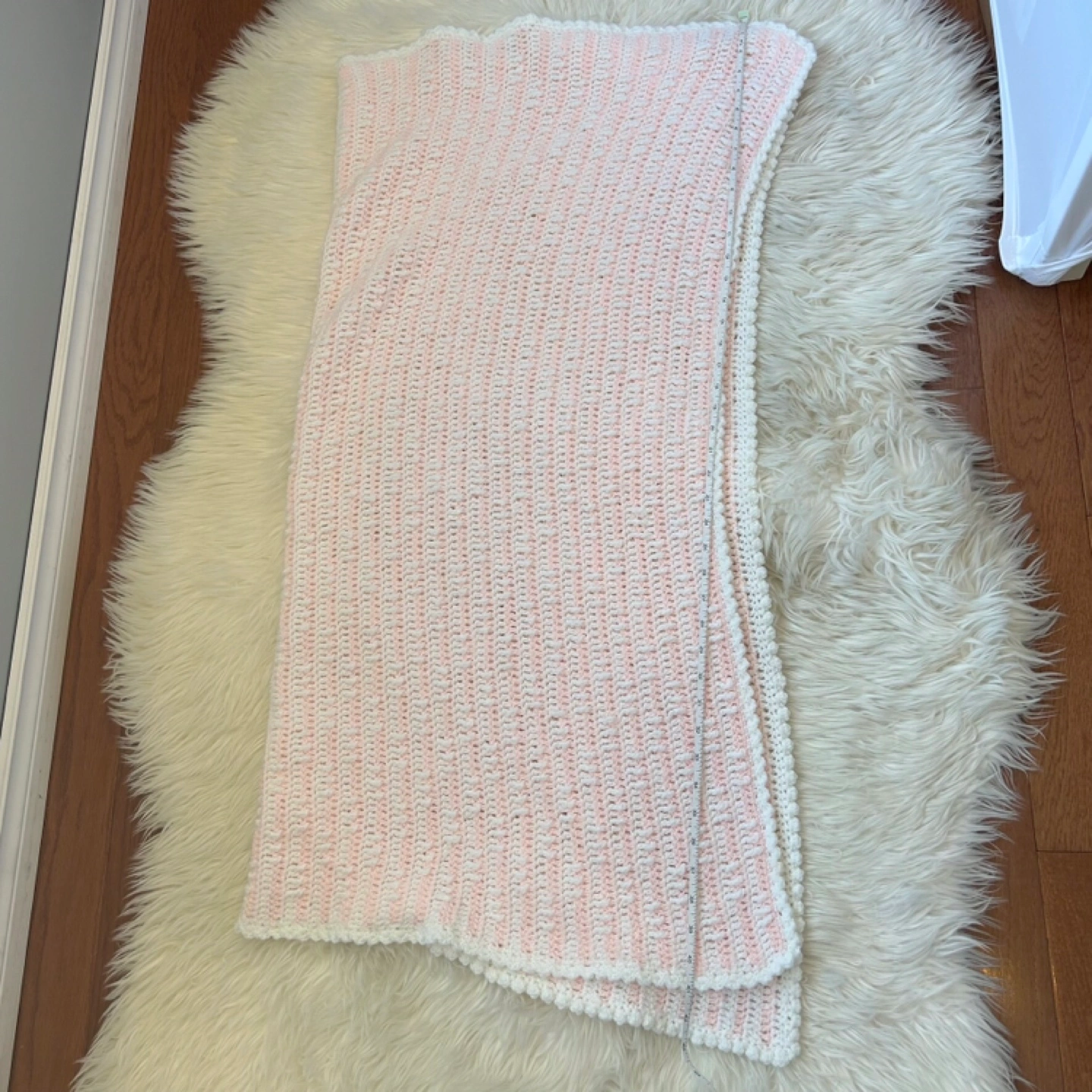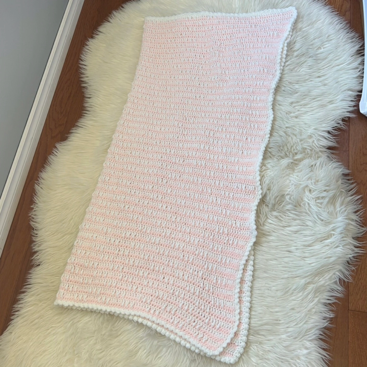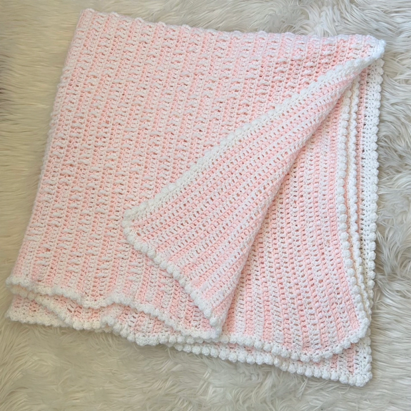 Charming knit blanket in pink and white. Perfect for warmth and style.