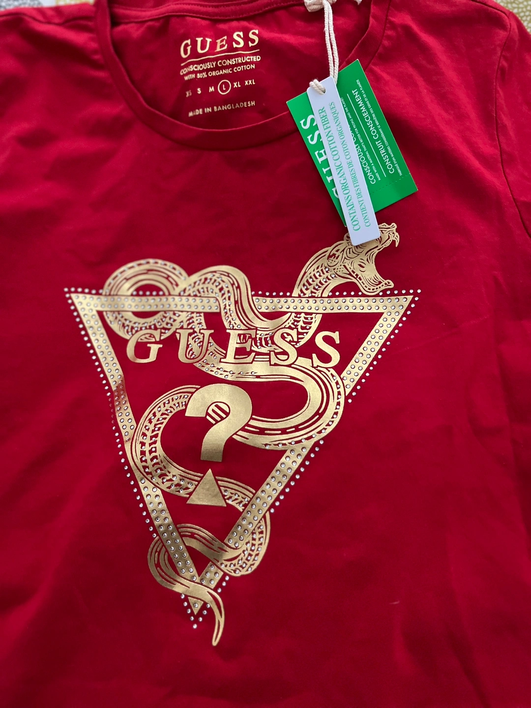 Women's red short-sleeved t-shirt. Features a gold snake design incorporating the GUESS logo. Made in Bangladesh. Size Large