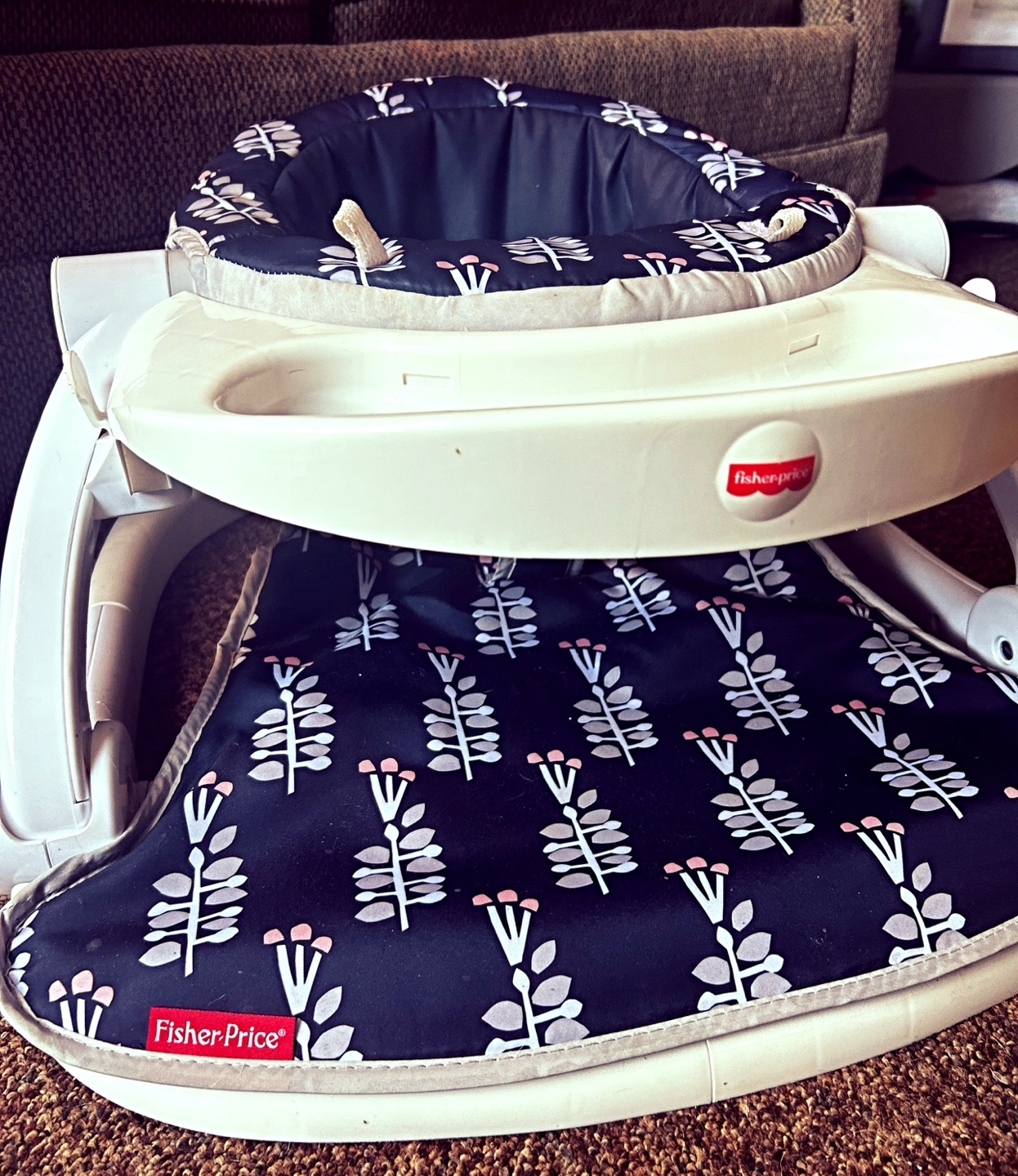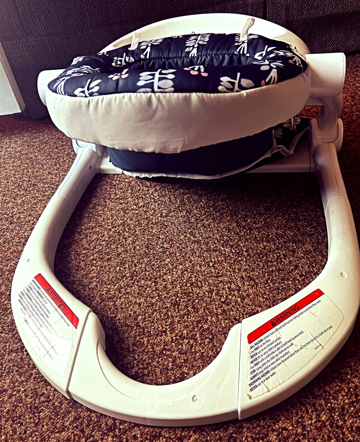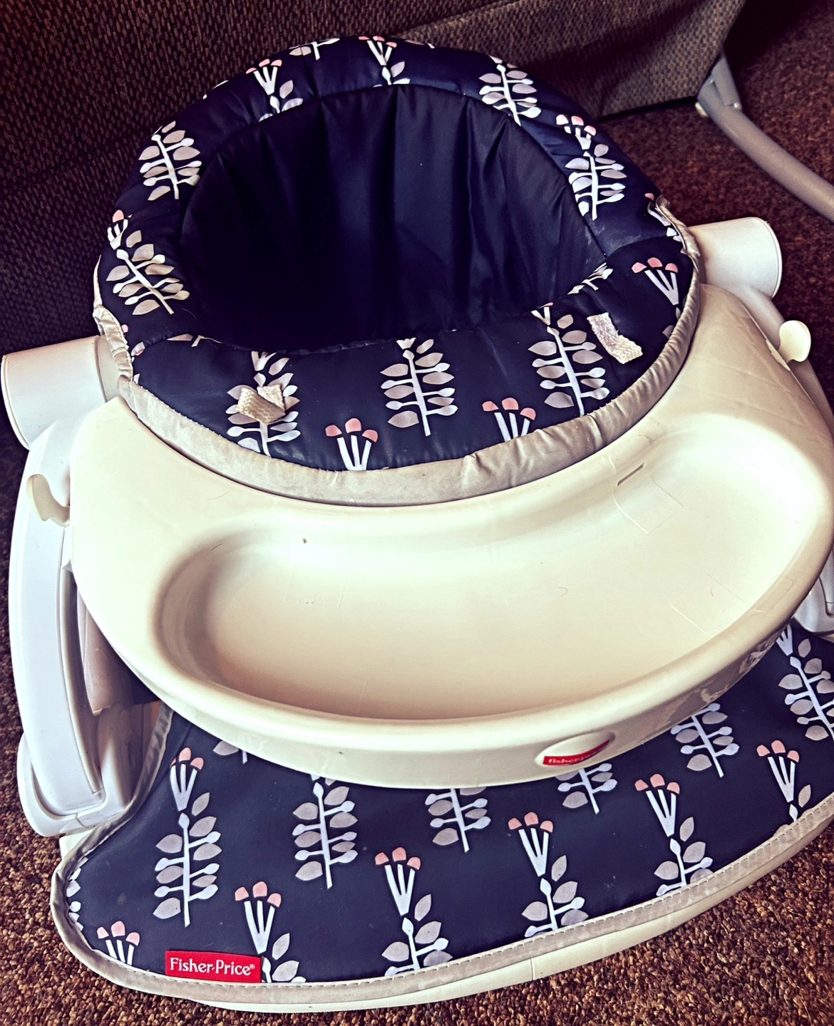 Used baby floor seat. Features a removable tray and padded seat. Dark floral pattern. Good condition.