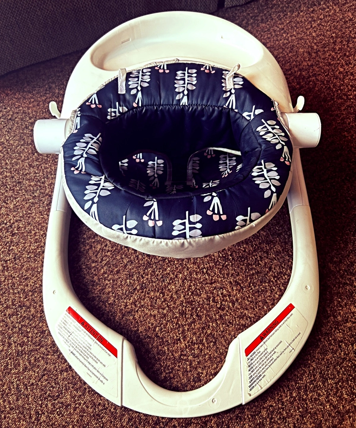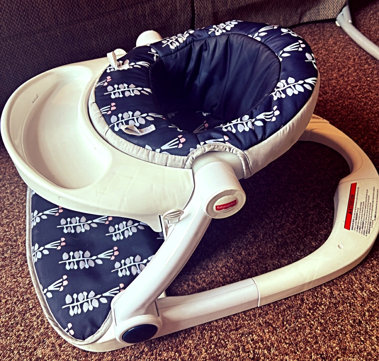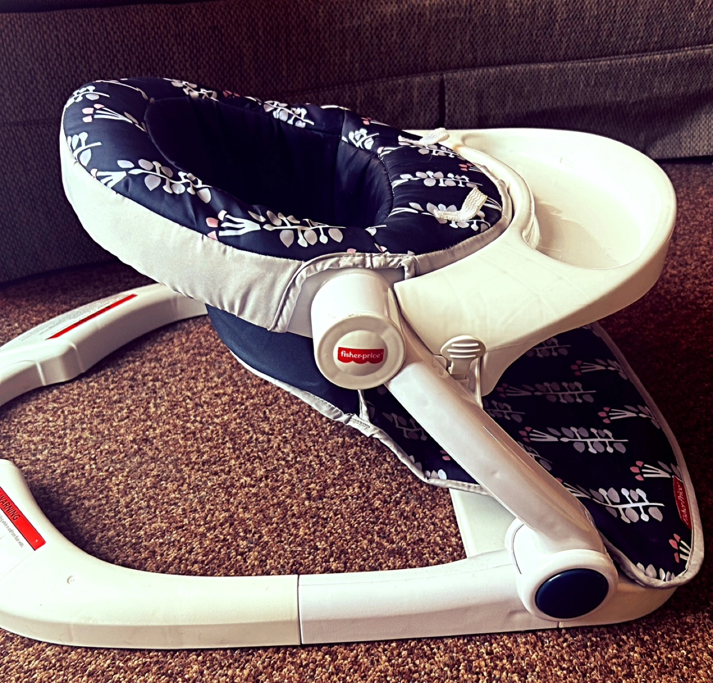 Used baby floor seat. Features a removable tray and padded seat. Dark floral pattern. Good condition.