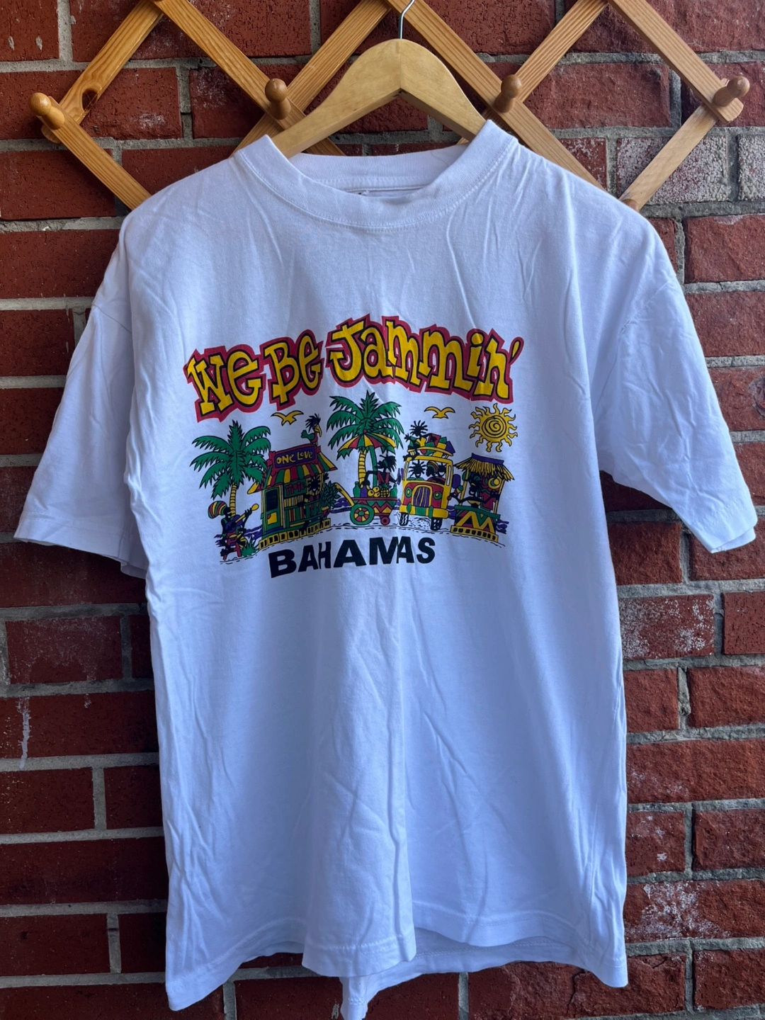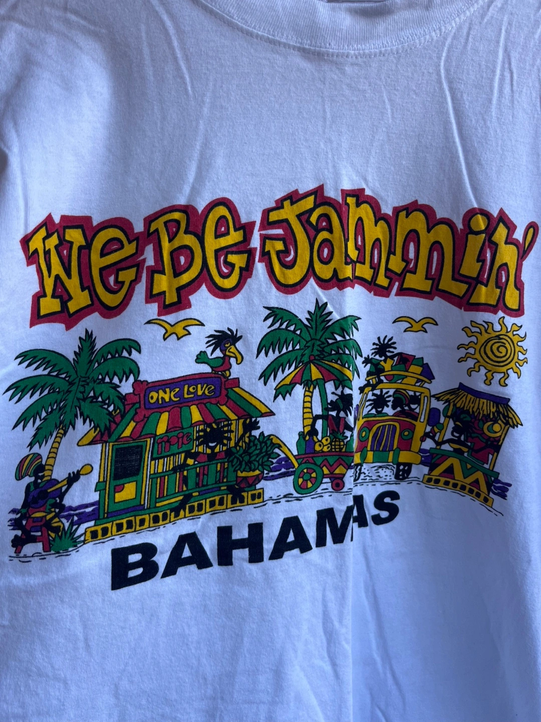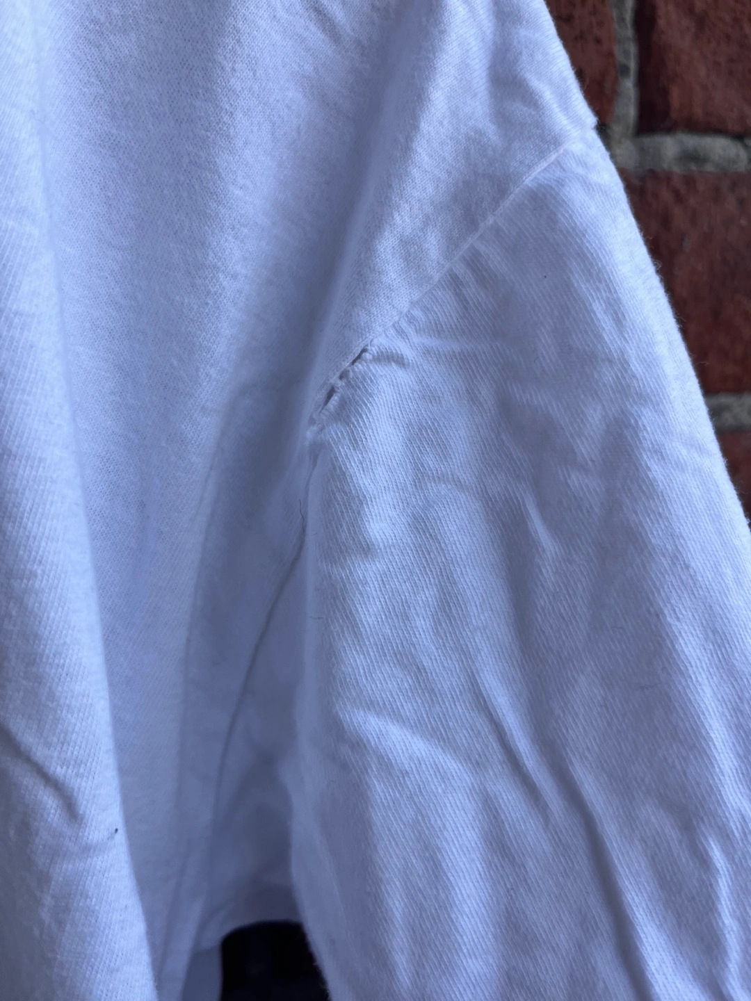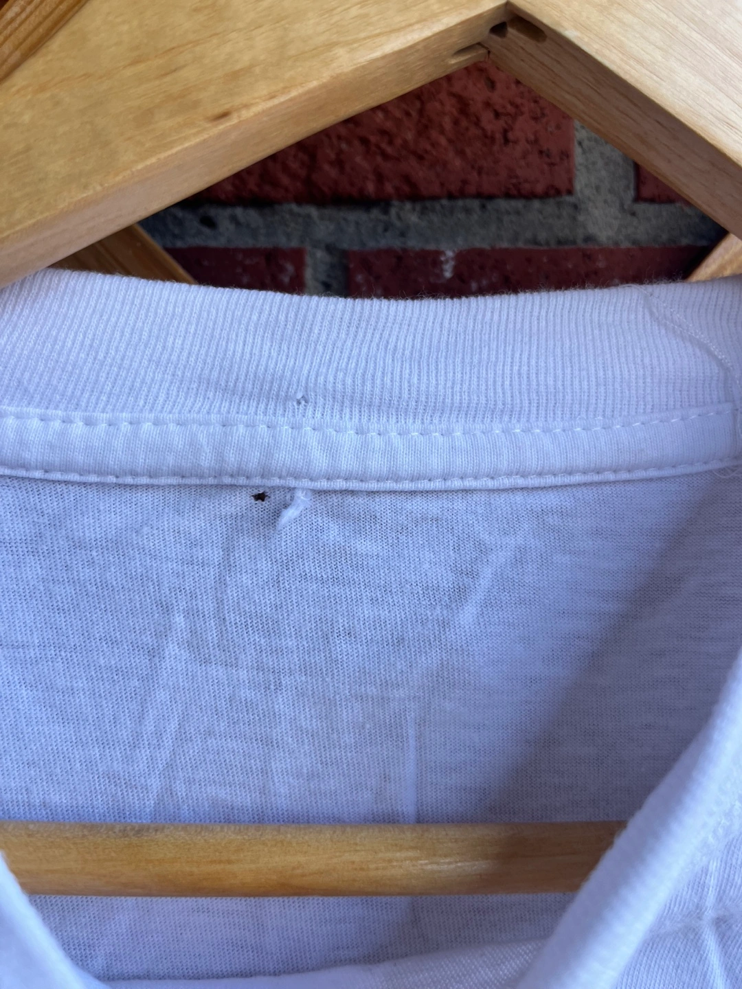 White short sleeve graphic tee. Features colourful illustration and text. Slight wear - sm hole under arm. Fits a women’s size m or men’s sm.