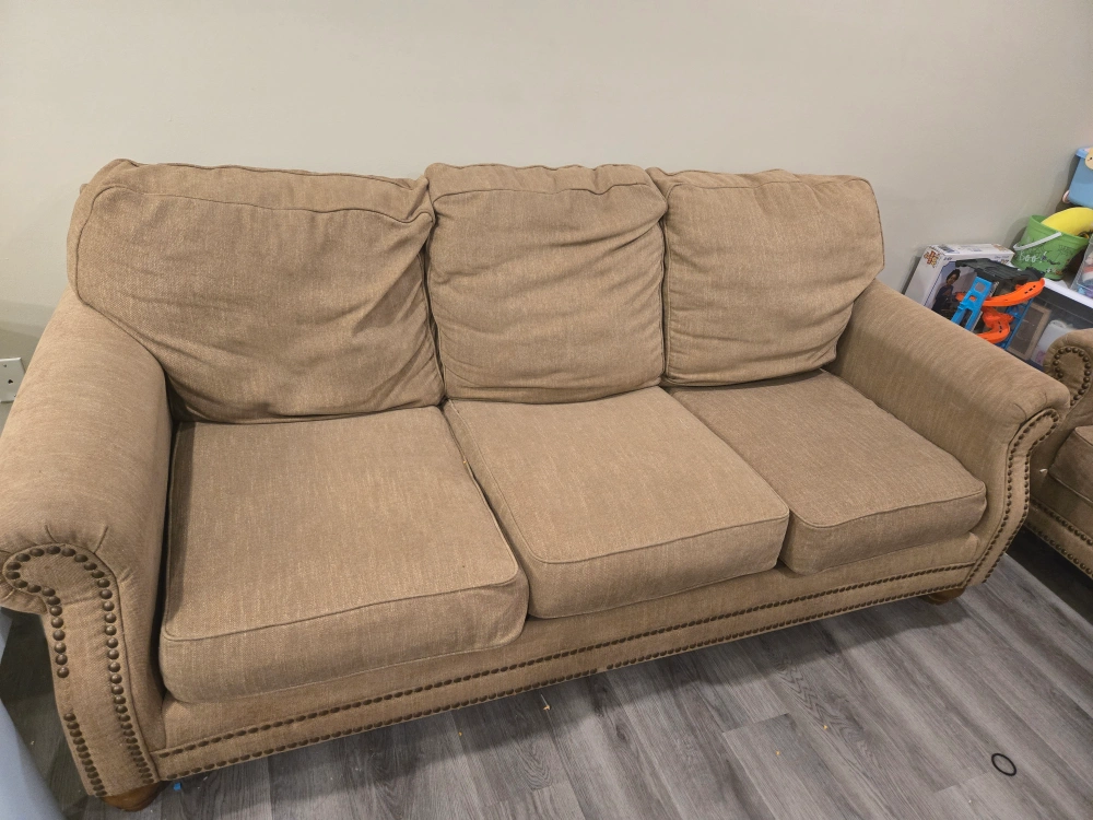 Comfortable sofa and loveseat set. Neutral beige fabric. Features nailhead trim. Solid wood legs. Good condition. Have some minimal stains