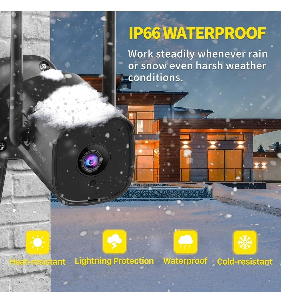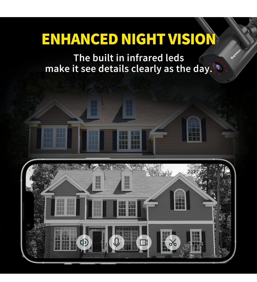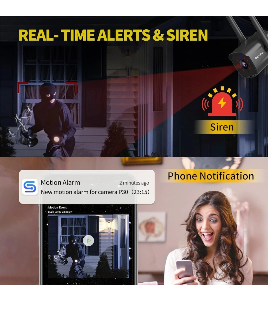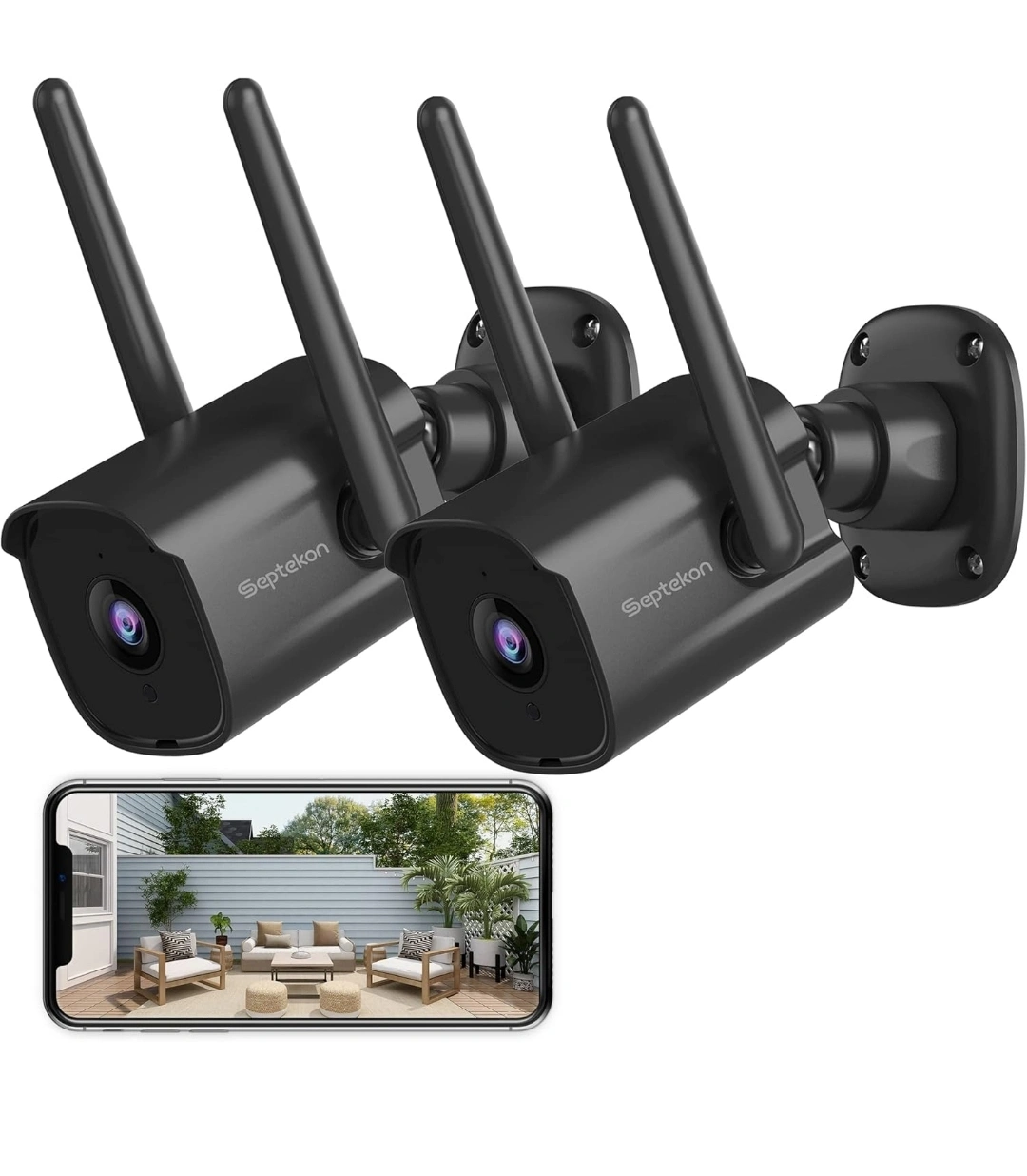 Two outdoor security cameras. Wireless, weatherproof, and features night vision. Real-time alerts and a built-in siren. View footage remotely via smartphone app.