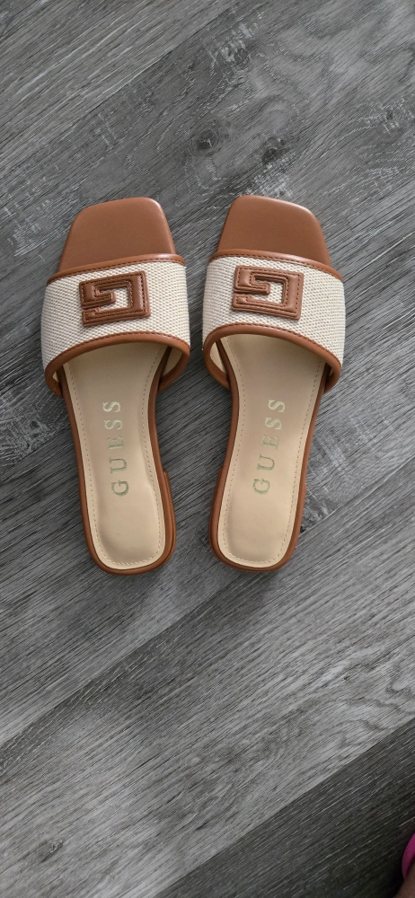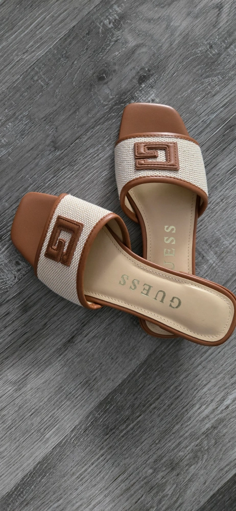 Pair of GUESS women's slides. Brown leather and beige fabric upper. Square toe. Low heel. Comfortable summer footwear.