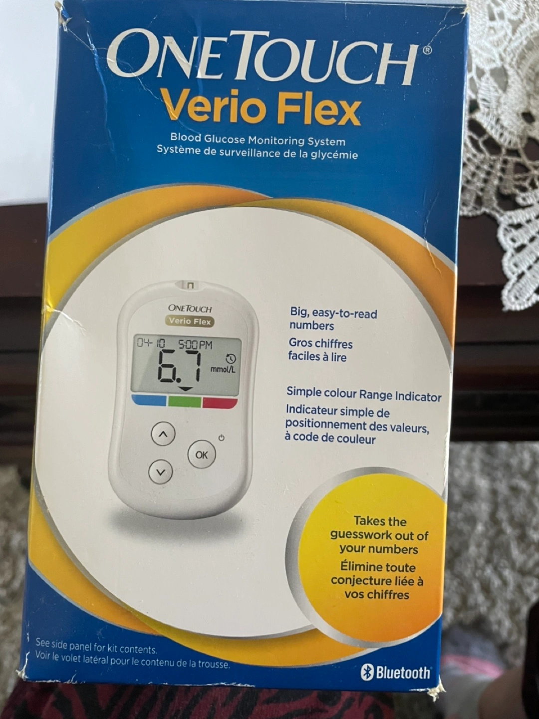 New, unopened blood glucose meter. Features large display, simple colour range indicator, and Bluetooth connectivity. Easy to use.