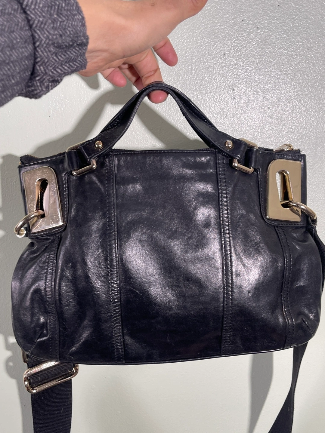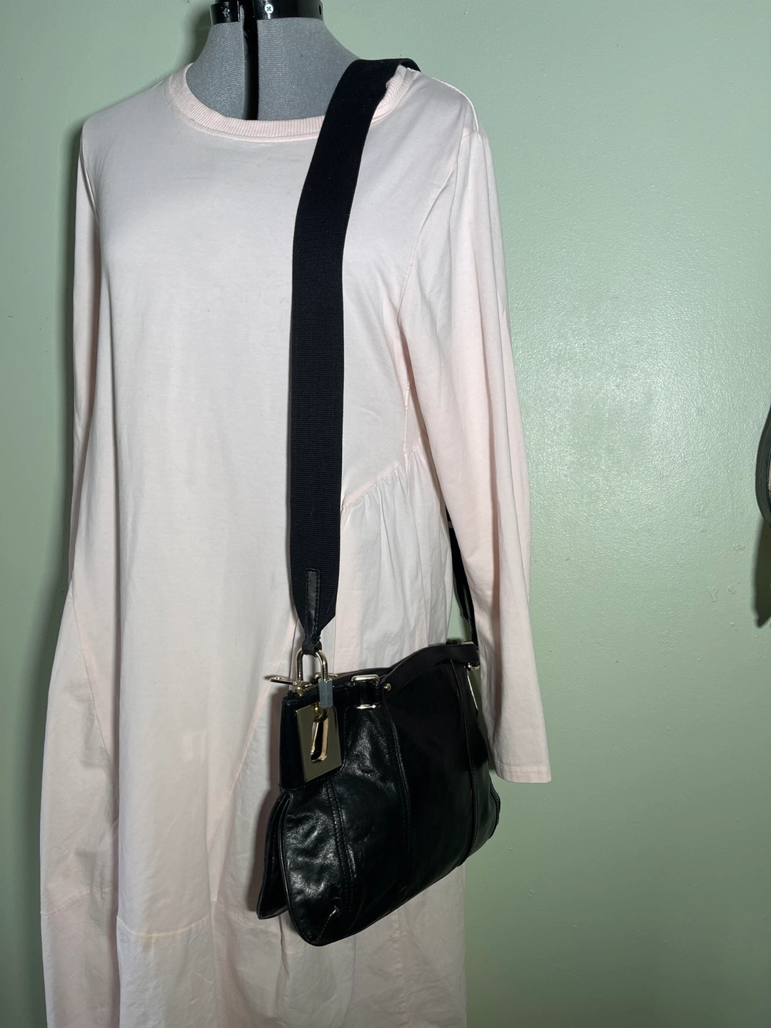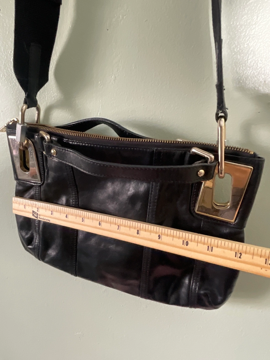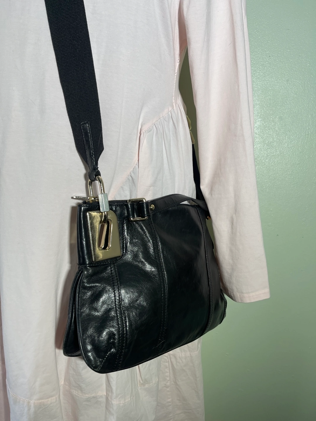 Black leather crossbody bag. Features a zip closure, adjustable strap, and gold-toned hardware. Roomy main compartment. Pre-owned.