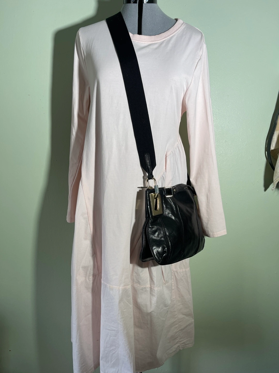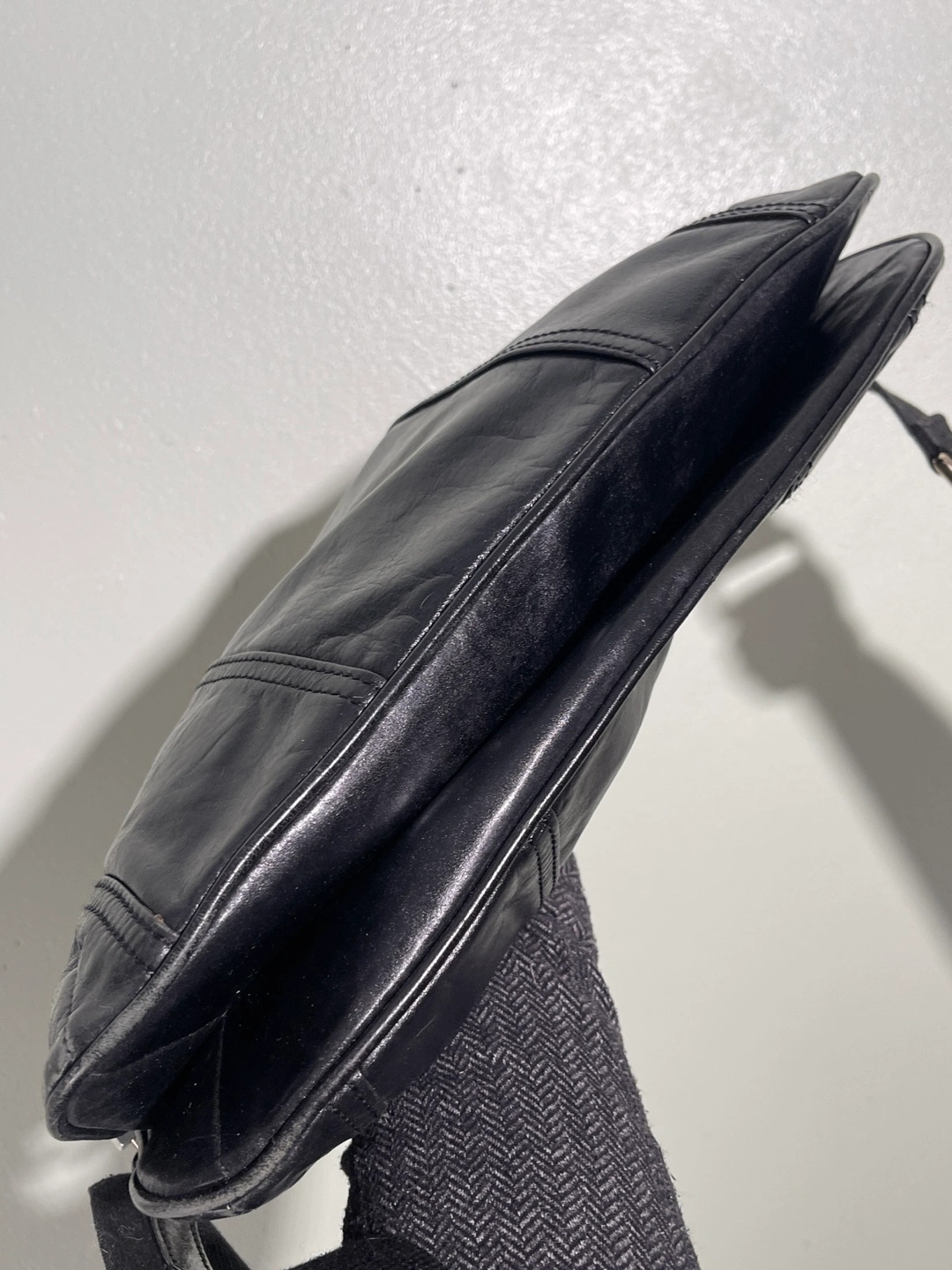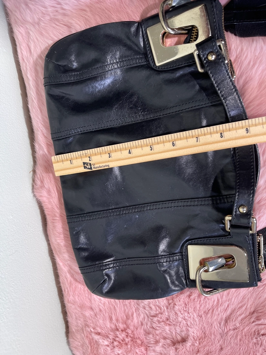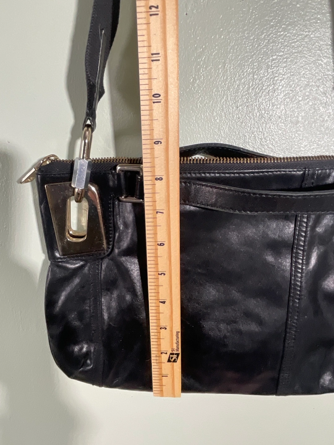 Black leather crossbody bag. Features a zip closure, adjustable strap, and gold-toned hardware. Roomy main compartment. Pre-owned.