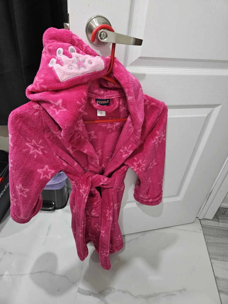 Pink fleece robe. Features a hood with a princess crown detail. Size 7/8. Soft and cozy.