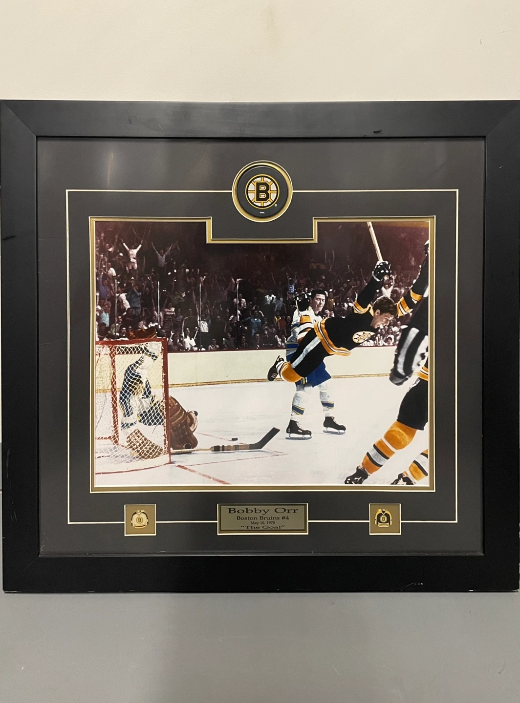 Professionally framed photo of Bobby Orr scoring his famous goal. Includes a commemorative plaque, Boston Bruins jersey pins, and puck. Great piece of hockey history.