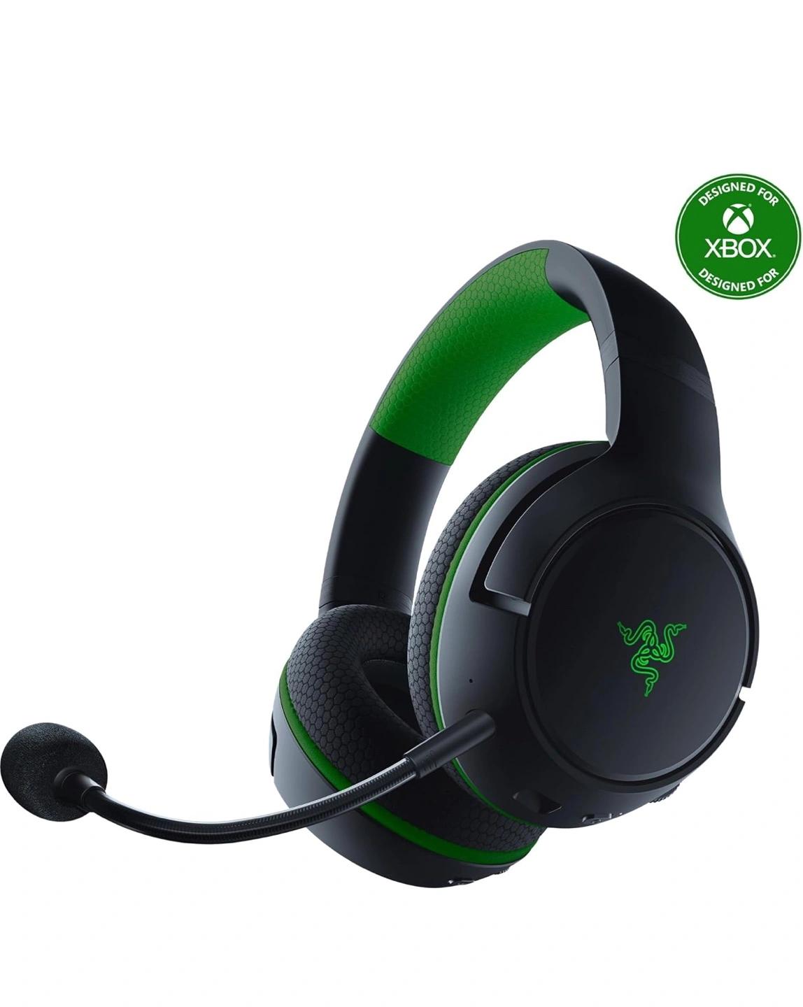 Black Razer Kaira Pro wireless gaming headset. Designed for Xbox. Features dedicated mobile mic, FlowKnit memory foam ear cushions, and Razer TriForce Titanium 50mm drivers. Enjoy high-end audio performance and long-lasting comfort.