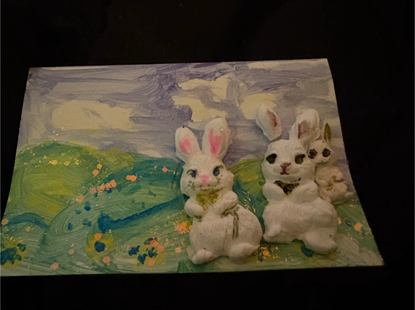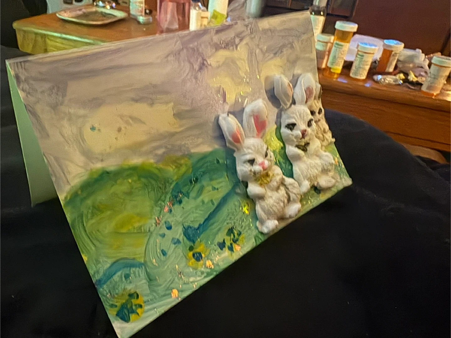 This is a unique, handmade card featuring adorable 3D Easter bunnies in a spring landscape. It's perfect for sending warm Easter wishes. The card's front has a textured, painterly design with glitter accents.