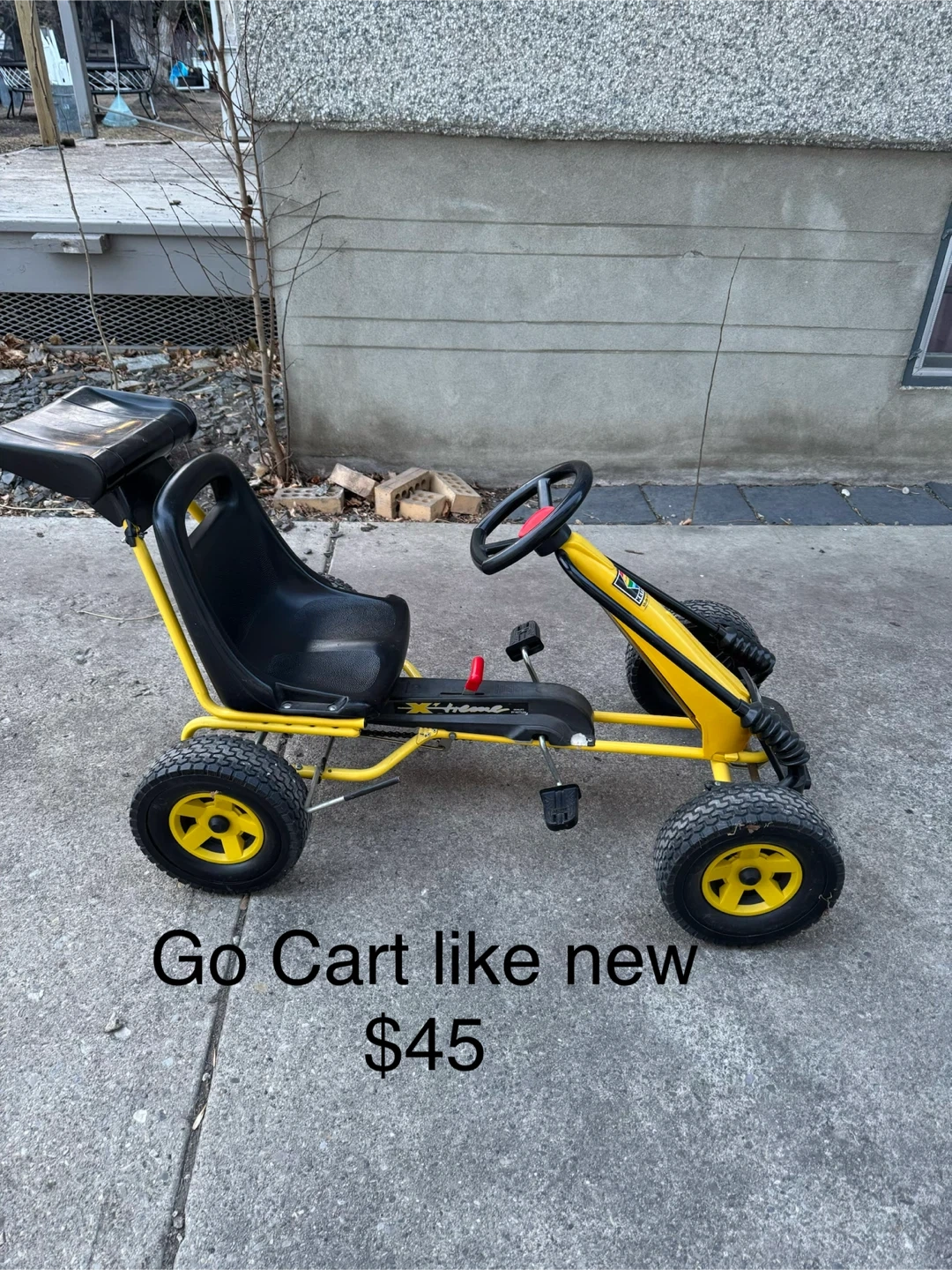 Pedal-powered go kart in yellow and black. It's like new and ready for some outdoor fun! This go-kart is great for kids who love to race.