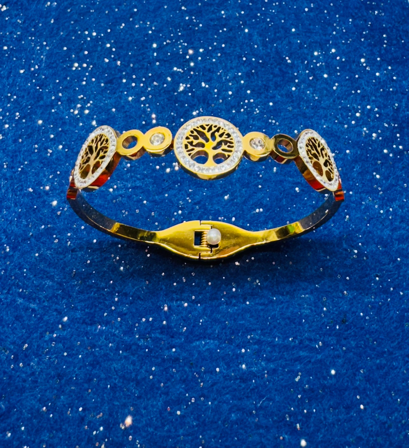 Stunning gold tone bangle bracelet. Features tree of life charms and clear accents. Hinged closure detail. Perfect accent for any outfit. NEW