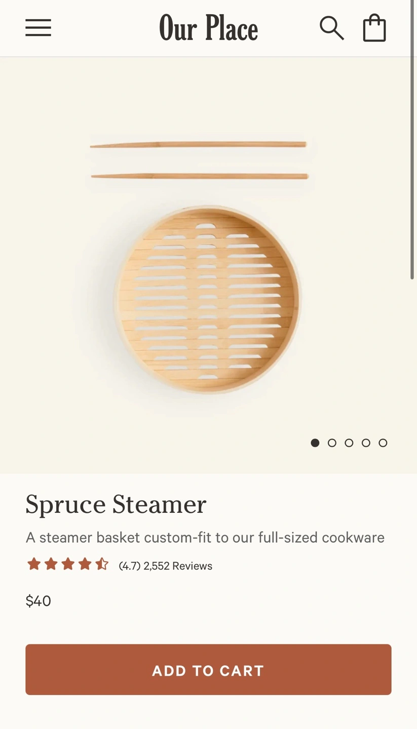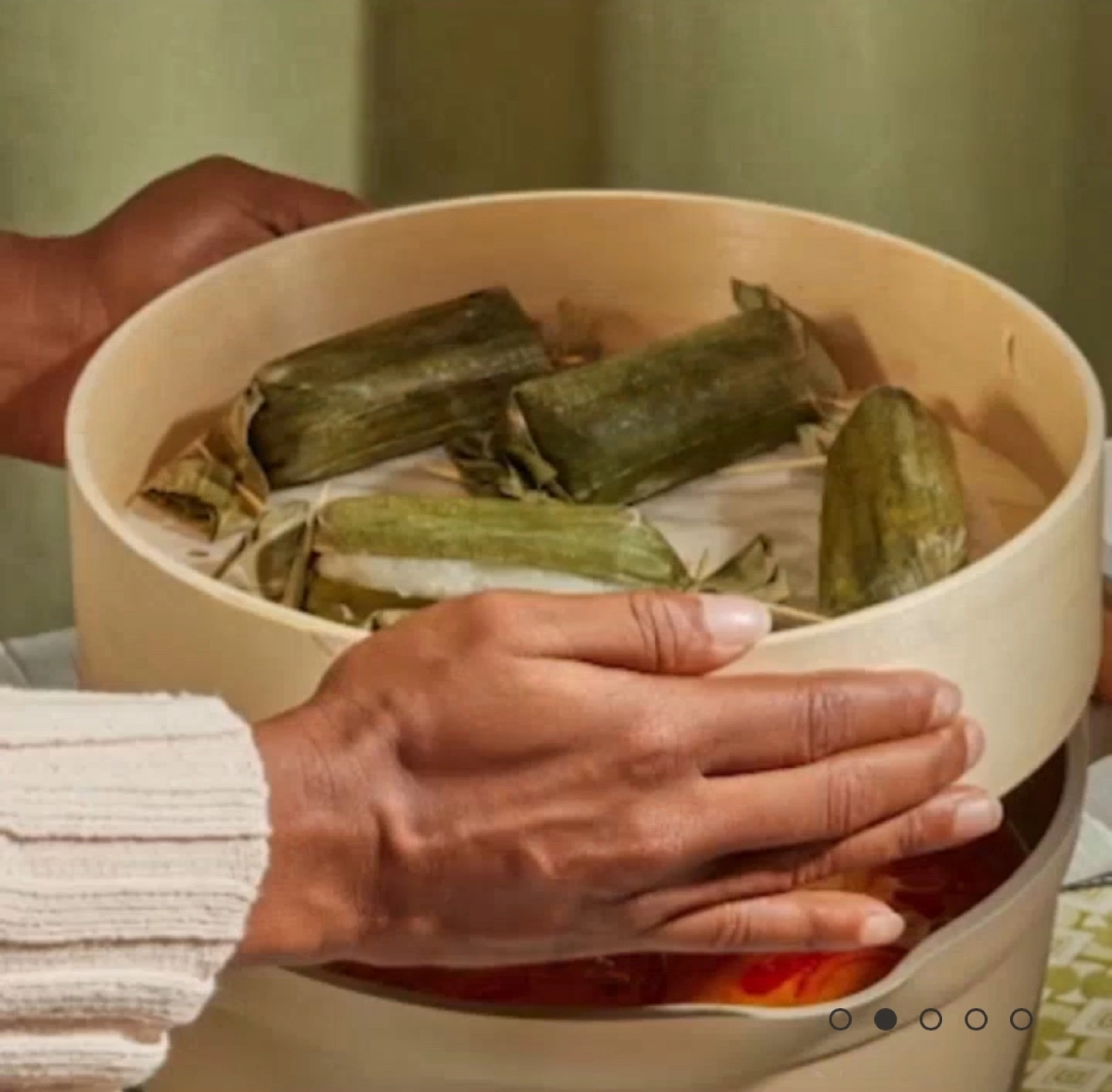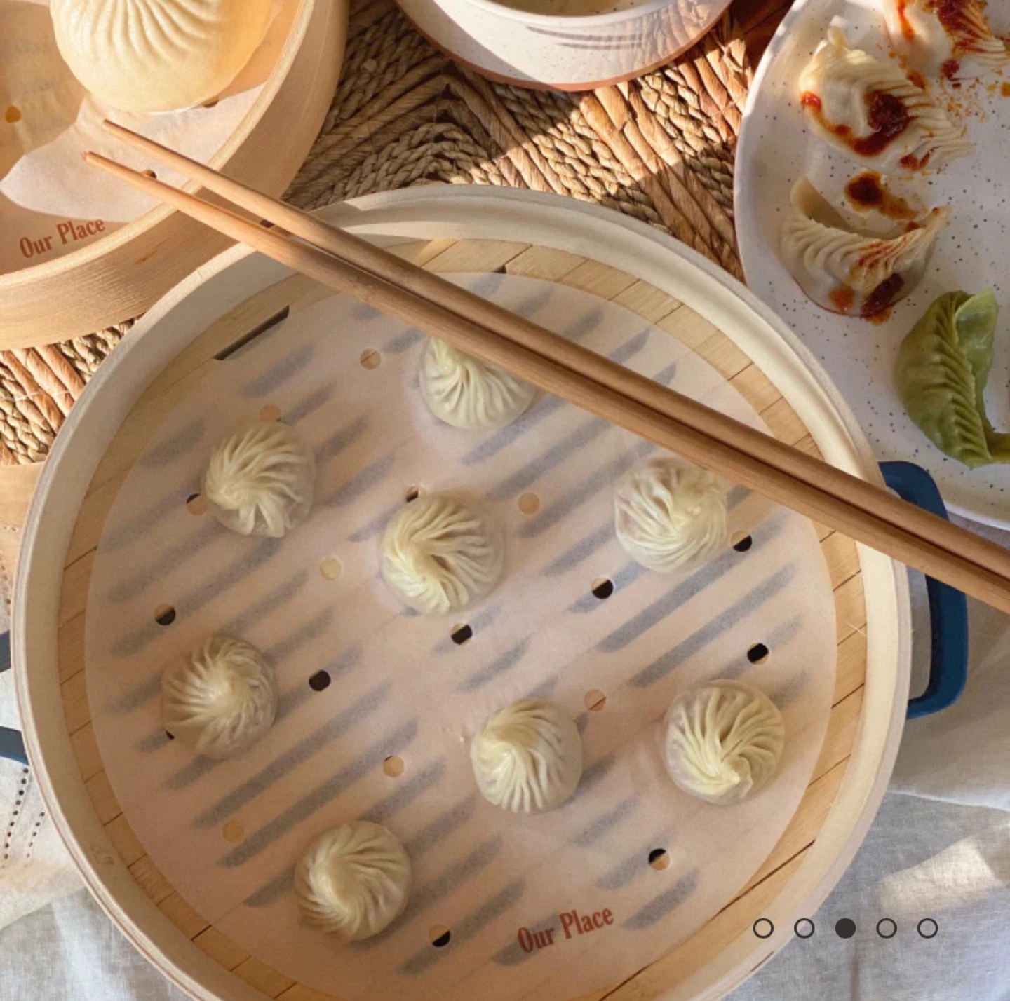 Bamboo steamer basket. Fits Our Place cookware. Great for steaming vegetables, dumplings, and more. Includes glass lid.