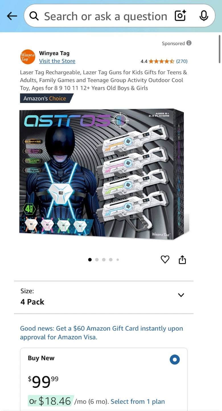 Four player laser tag set. Includes four laser guns and four vests. Rechargeable batteries. LED screens show ammo and lives. Great for ages 9+. 8m reach in dark.