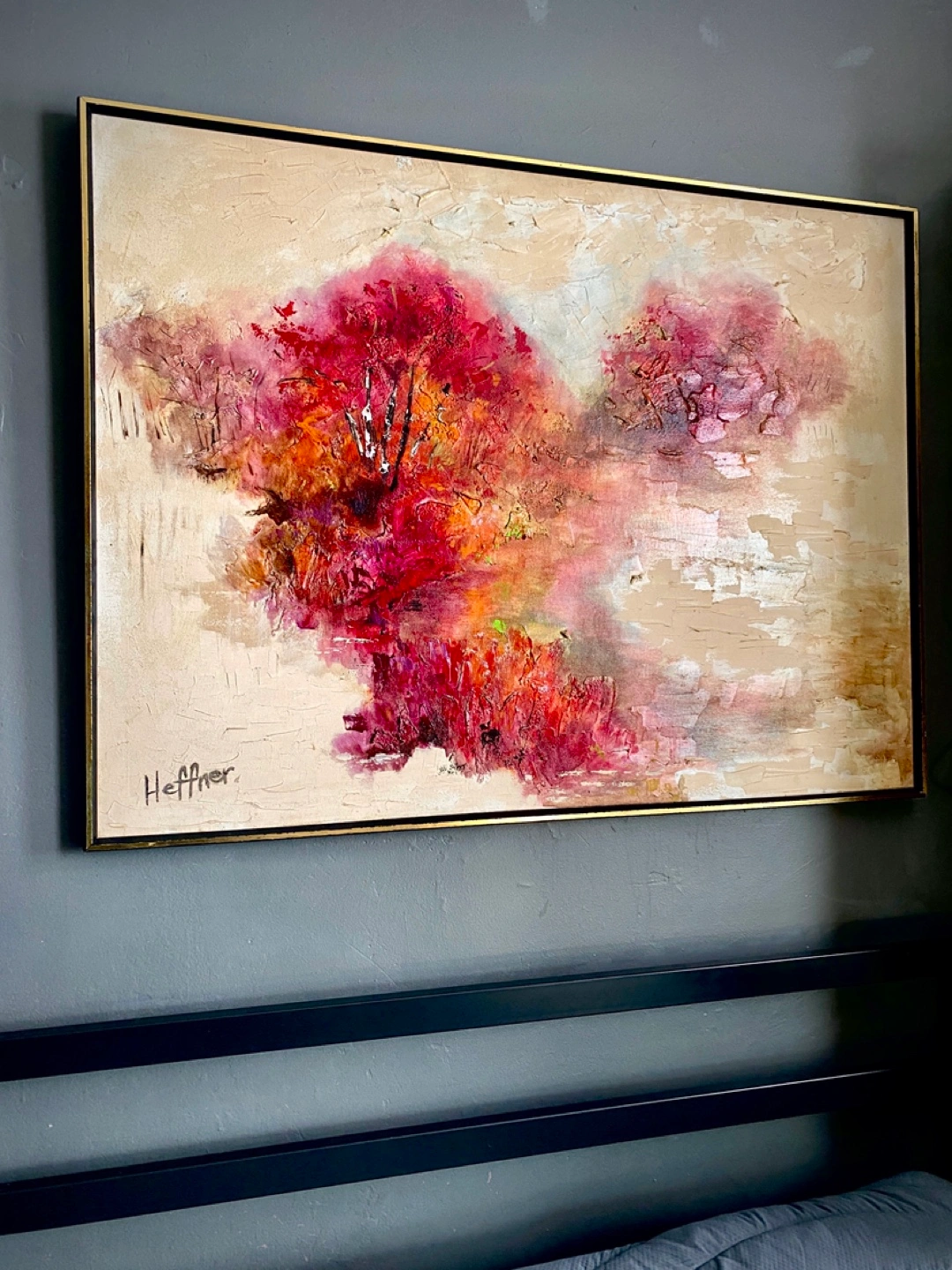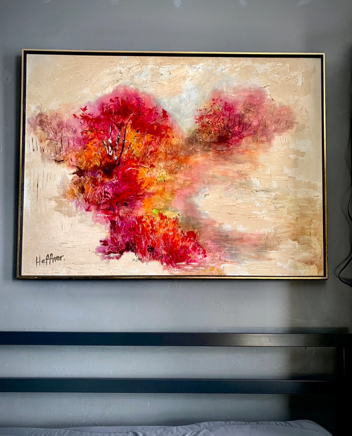 Beautiful fiery autumnal landscape oil painting by New York Artist Lynne Heffner Ferrante, titled ‘Landscape in Red’.