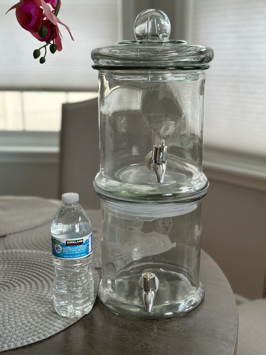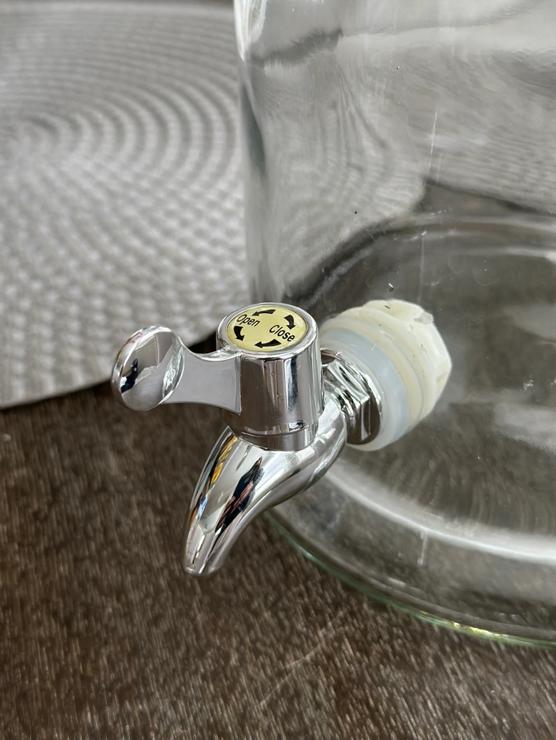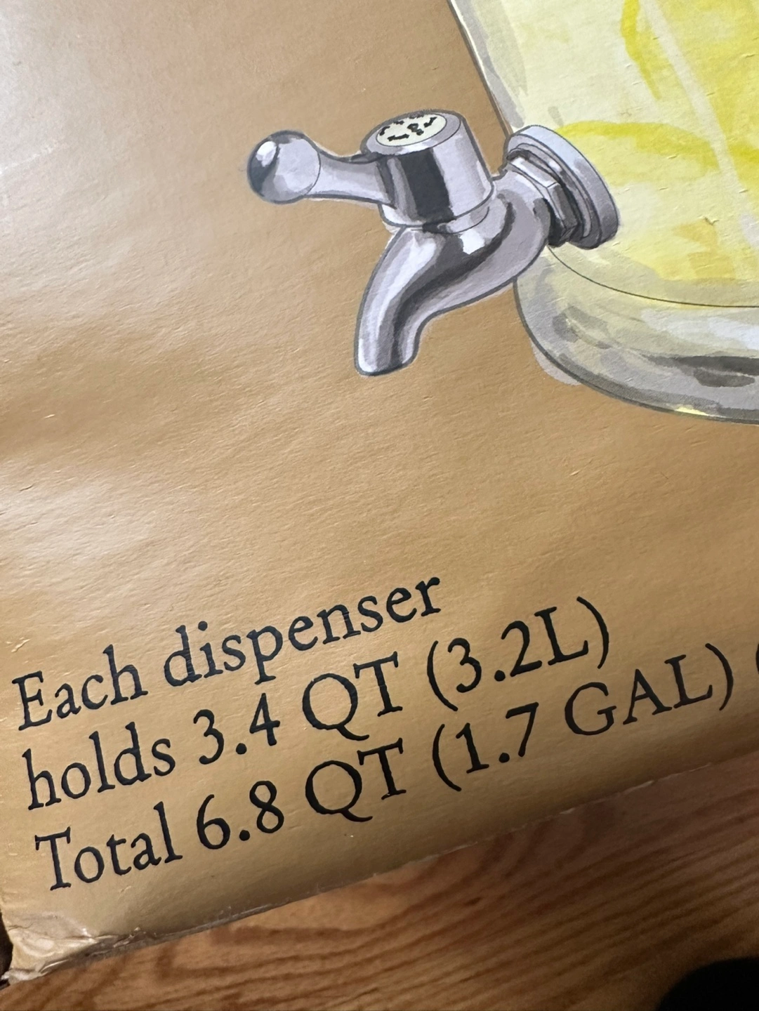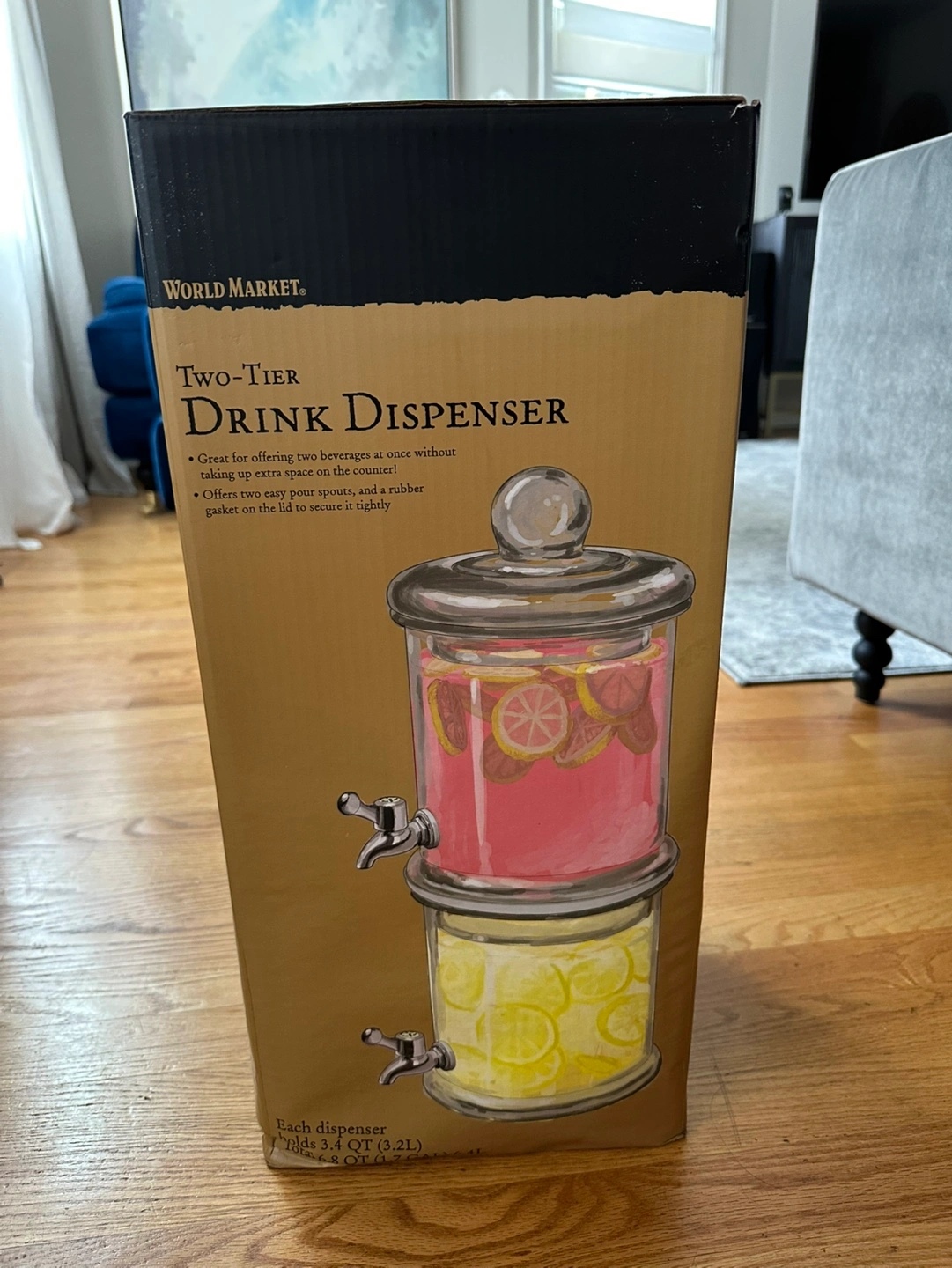 Two-tiered glass beverage dispenser. Each dispenser holds 3.4 quarts . Features two easy-pour spouts and rubber gaskets. Used once.