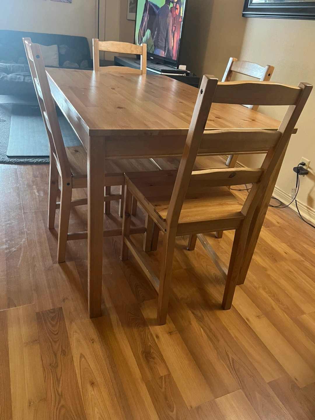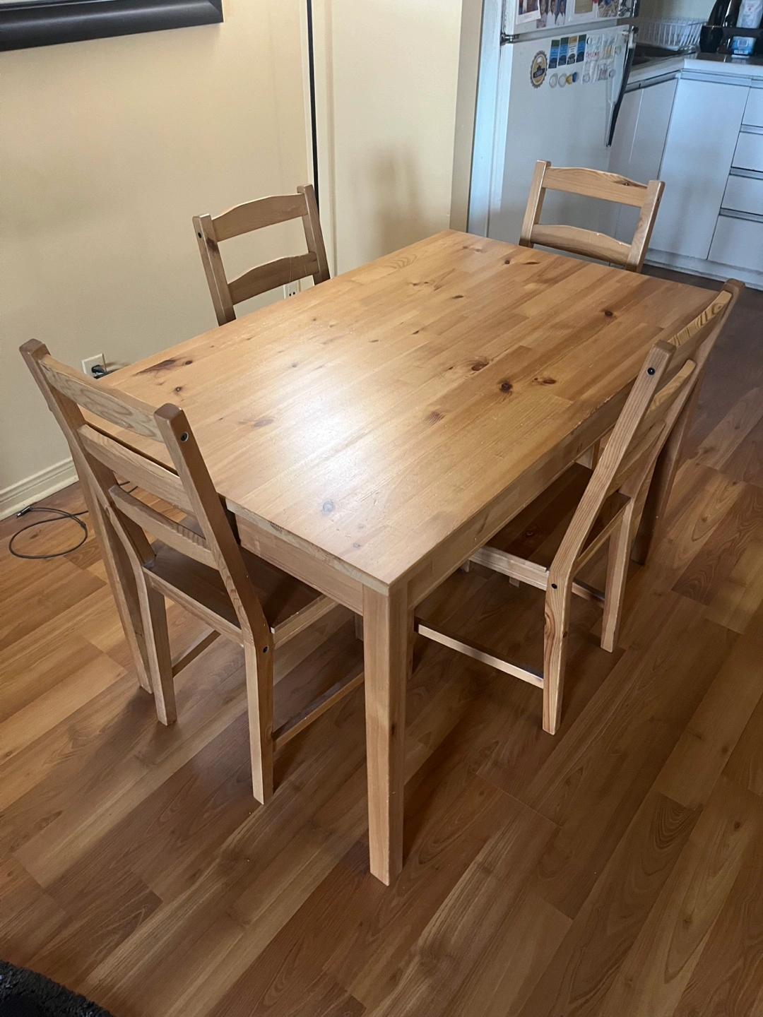 Classic IKEA wooden dining table with matching wooden chairs (4)