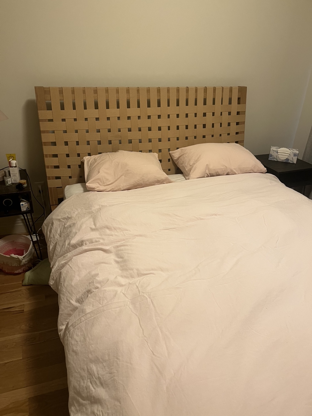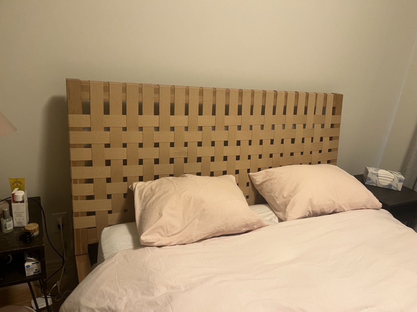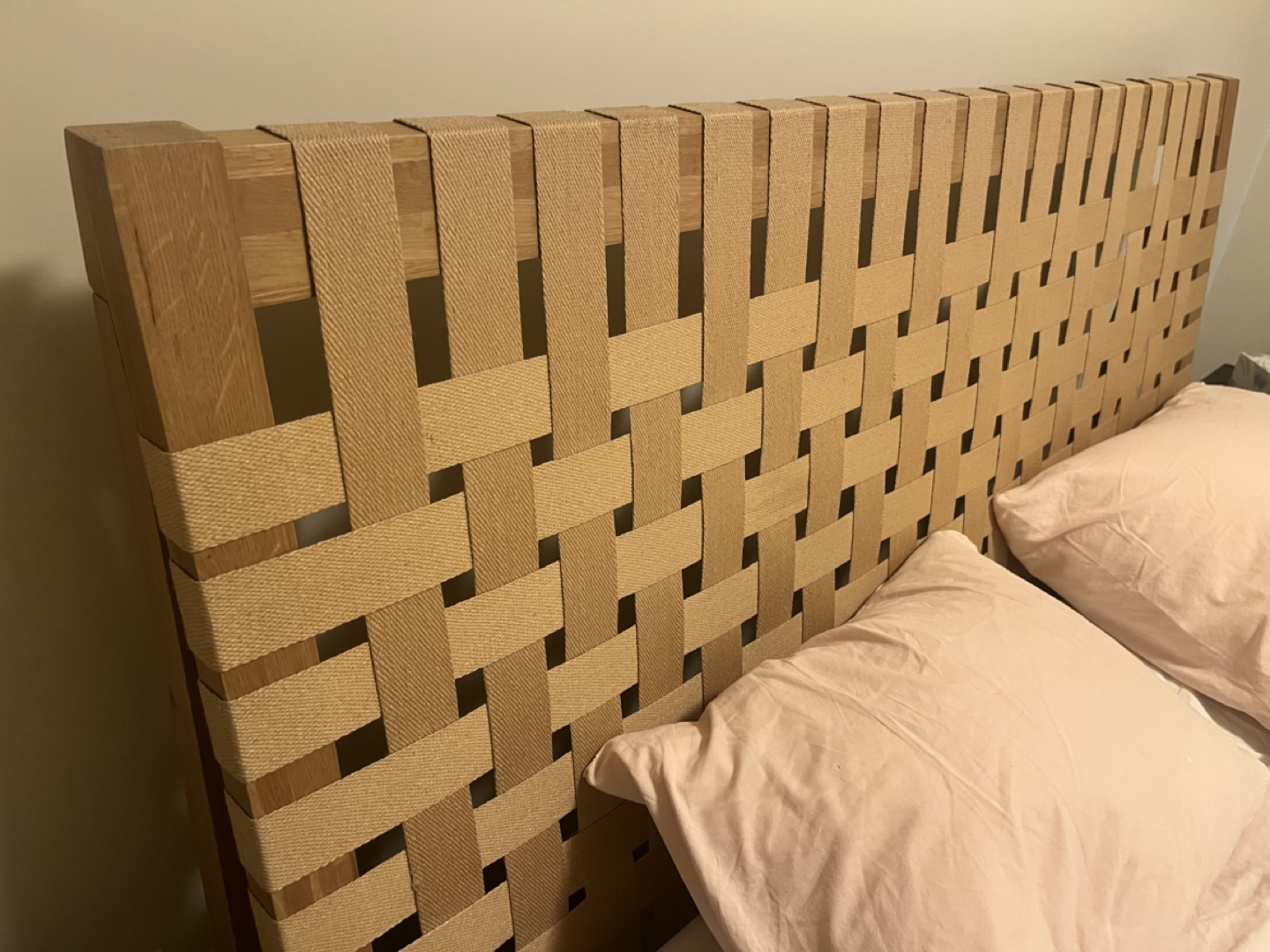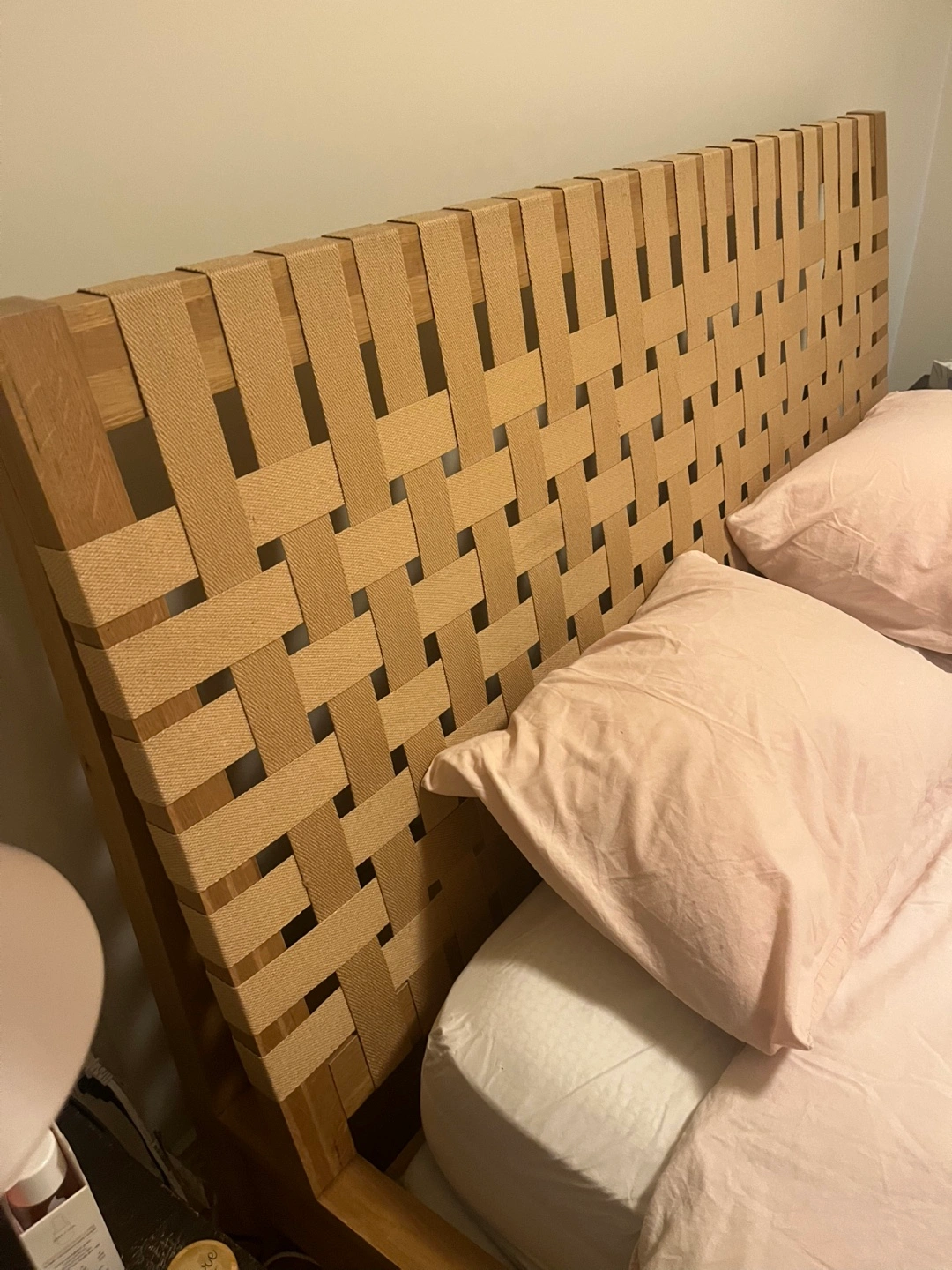 Unique woven headboard. Queen size. Light wood frame. Neutral tones. Adds a stylish touch to any bedroom.