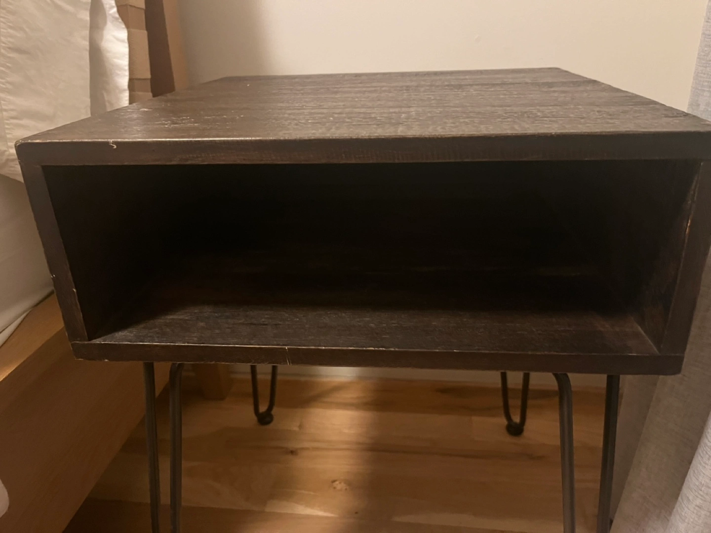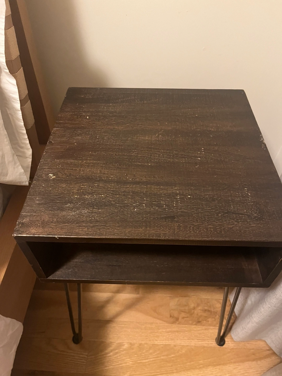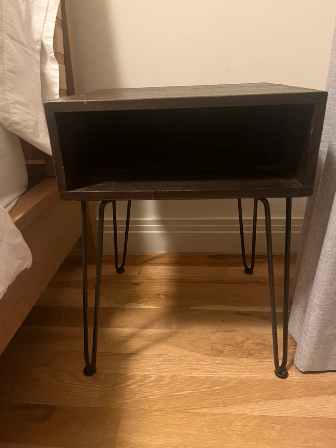 Small square nightstand. Dark brown wood finish. Open shelf. Metal hairpin legs. Minimalist style.