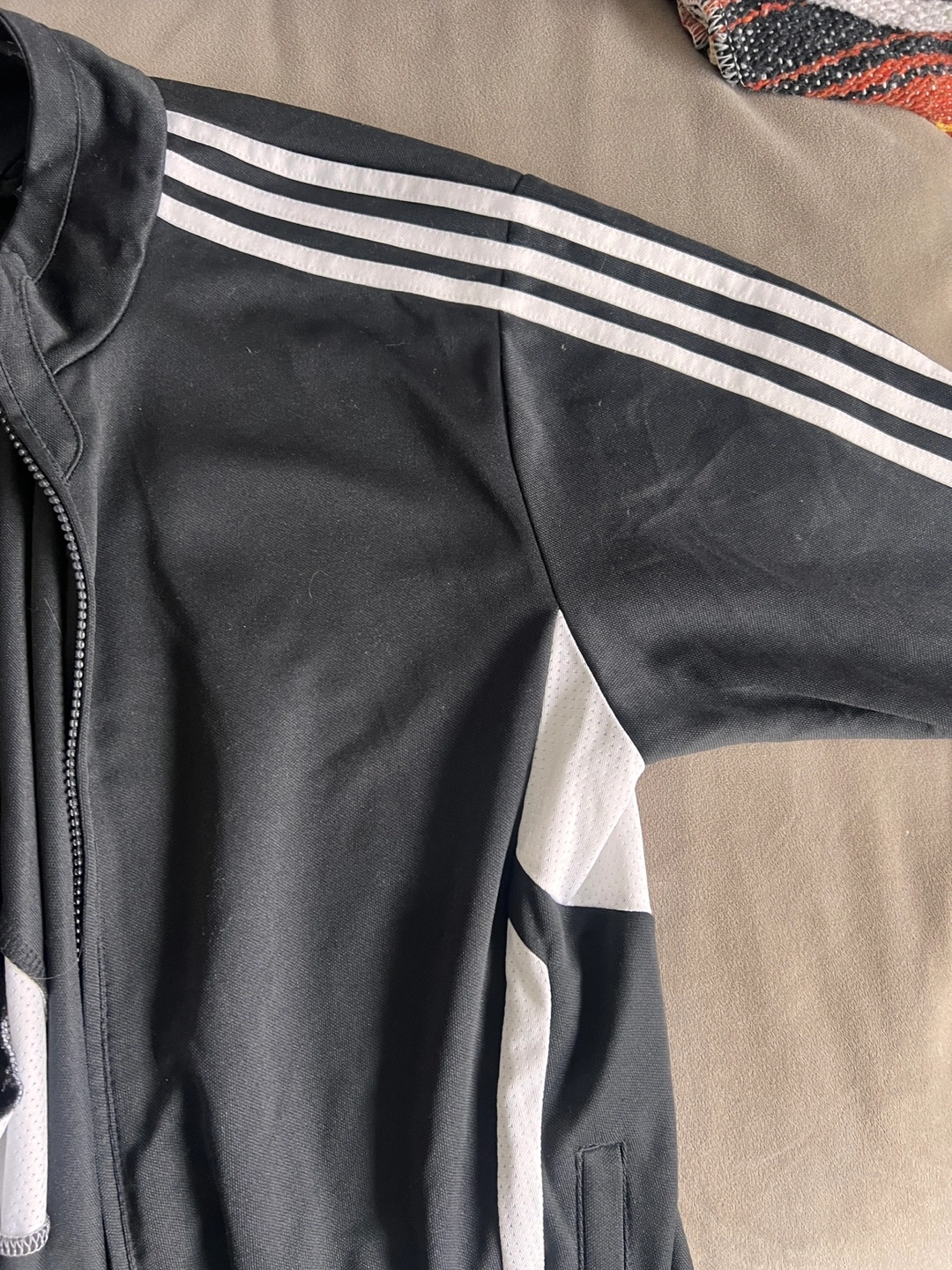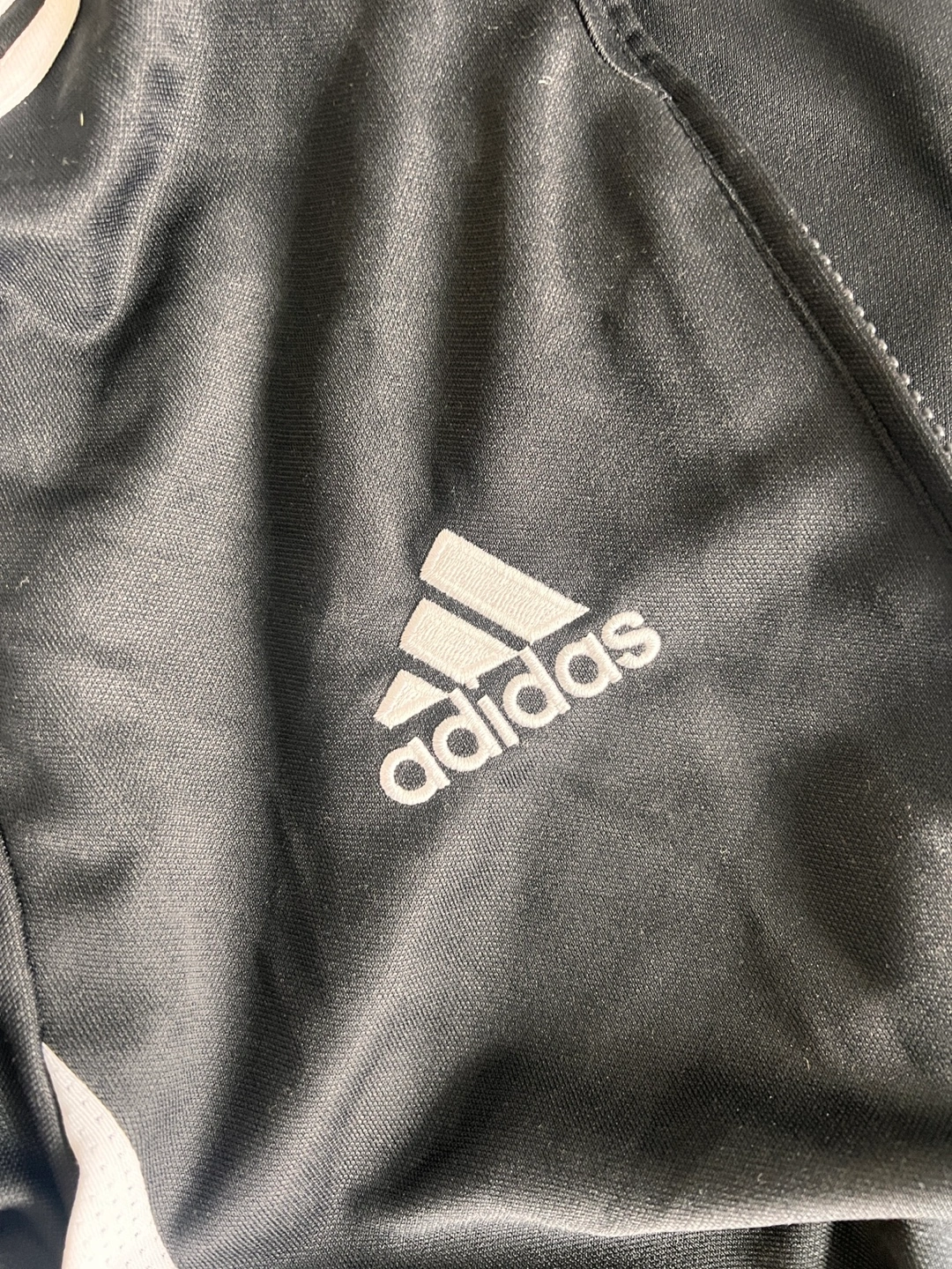 Black Adidas track jacket. Climacool technology. Features white stripes on the sleeves and shoulders. Zip closure. Men's size small