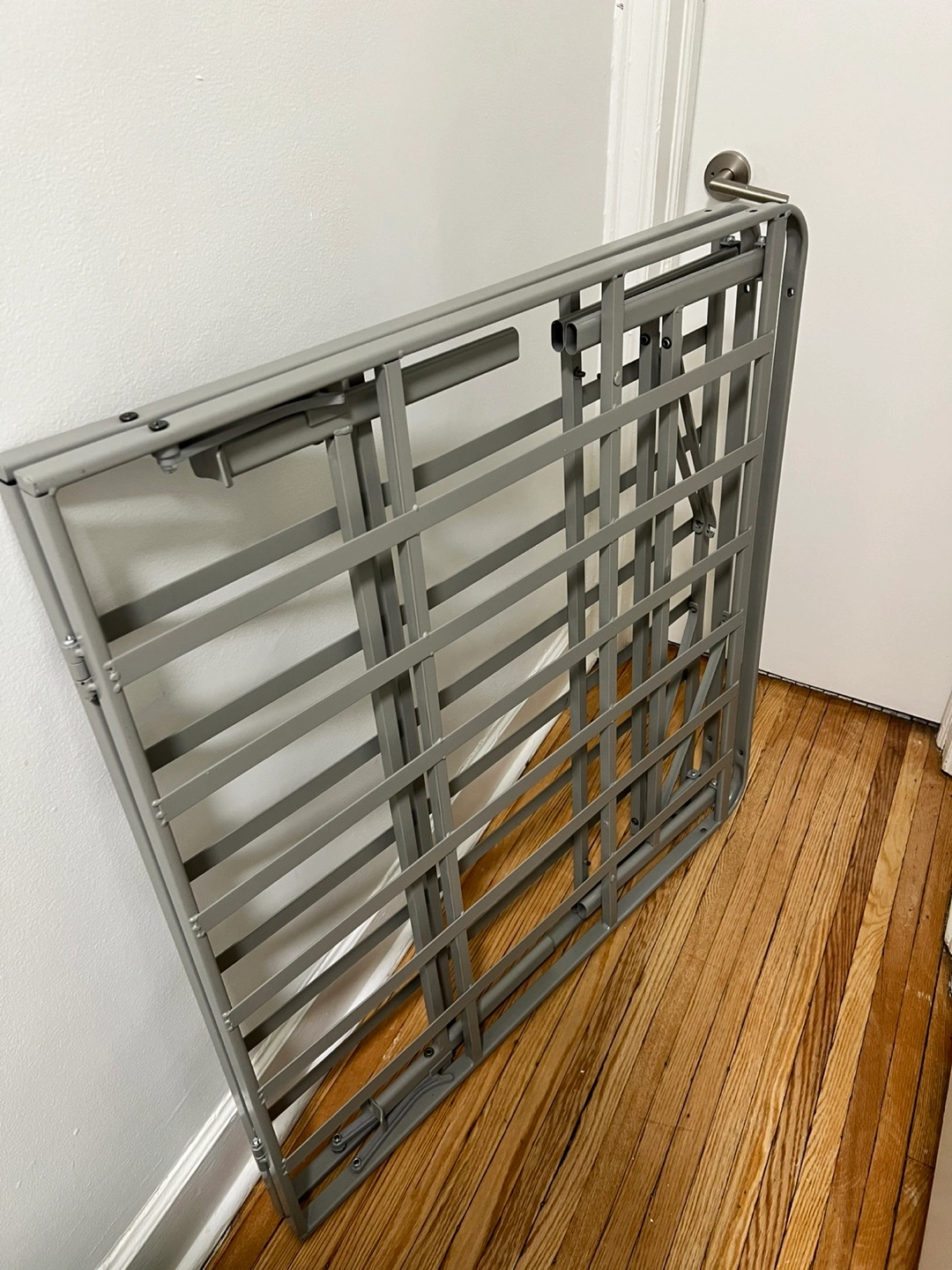 Grey metal bed frame. Folds for easy storage. Good condition. Leg parts are in a bag.