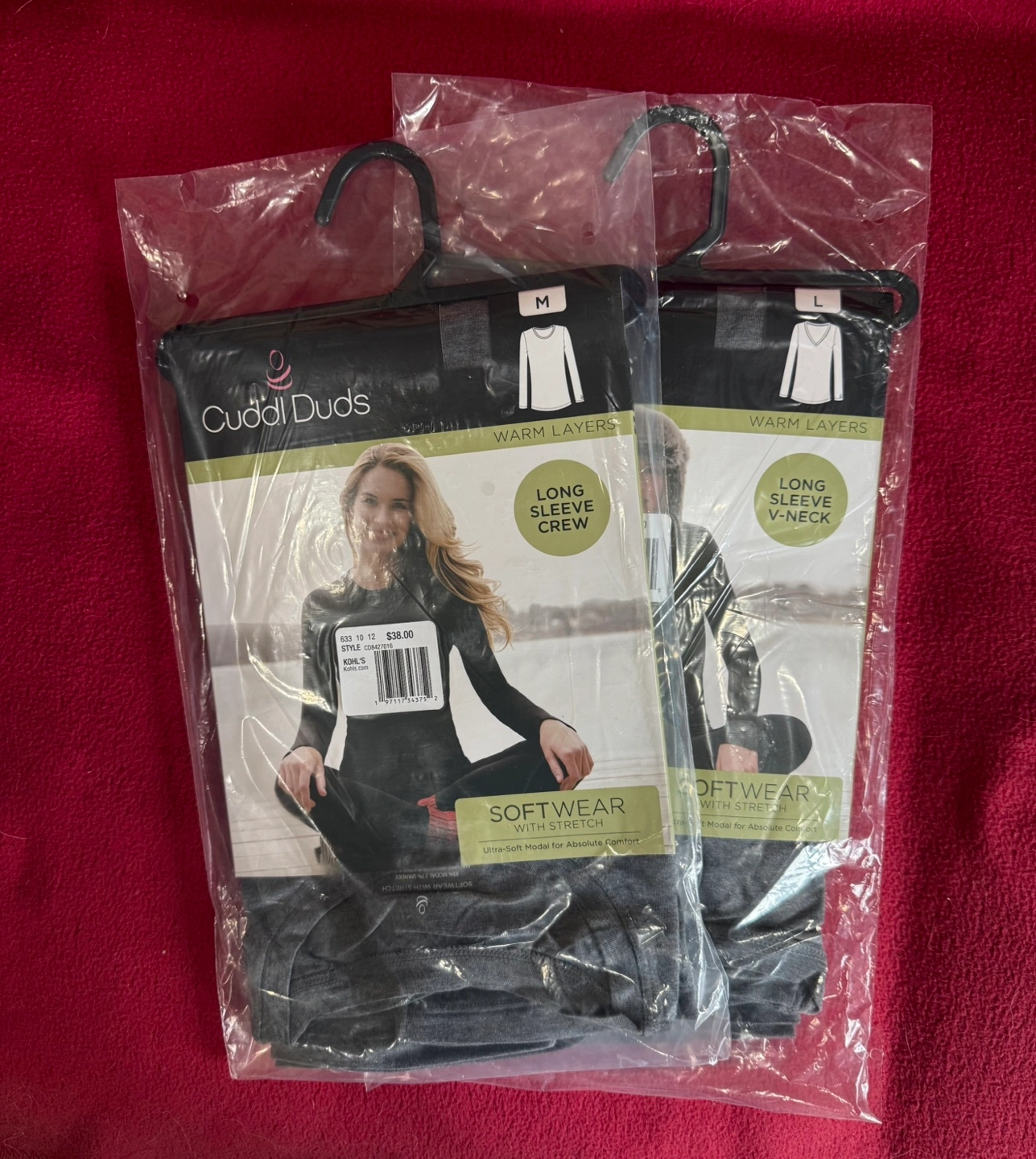 Warm layers. Softwear with stretch. Modal and Spandex. Long sleeve crew and V-neck tops. Sizes Medium and Large.