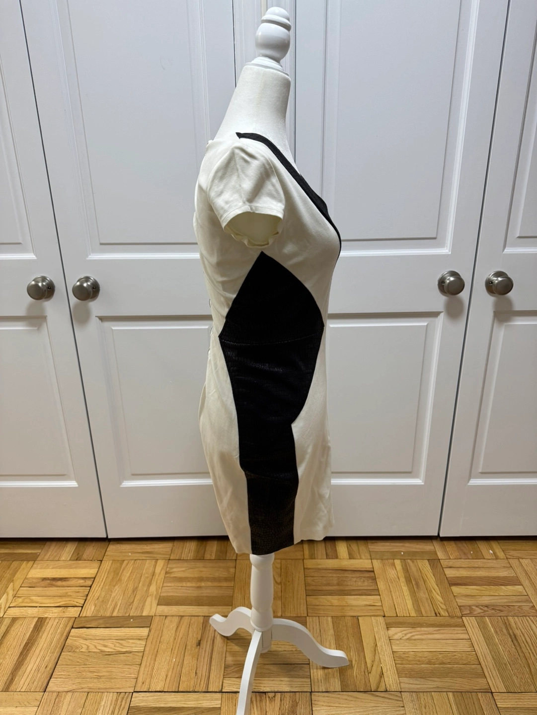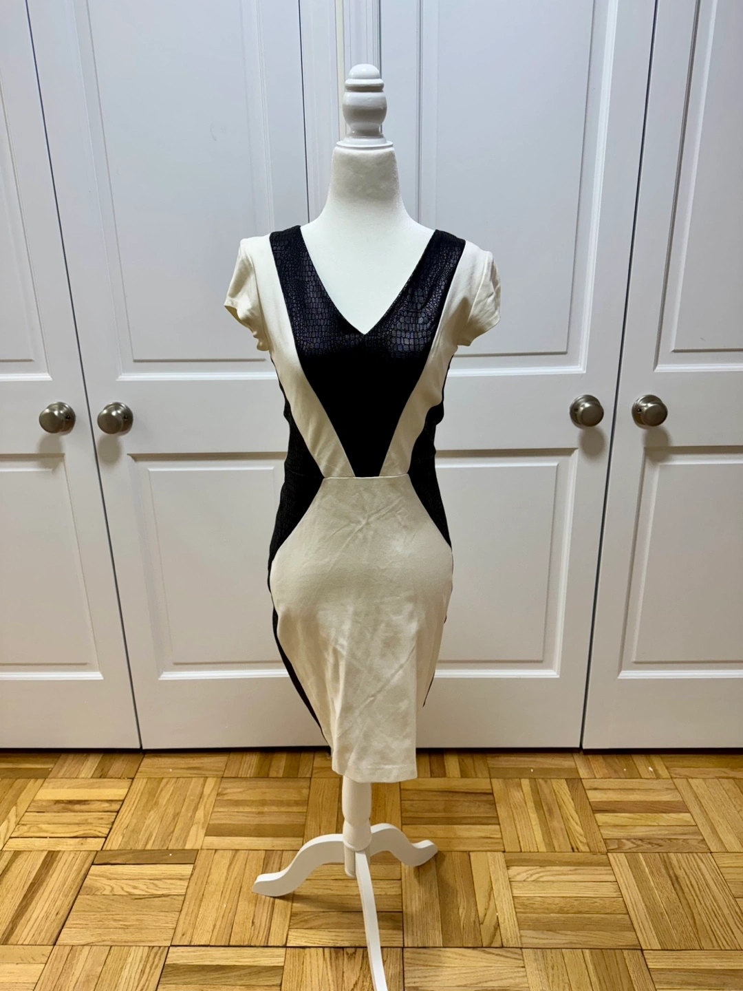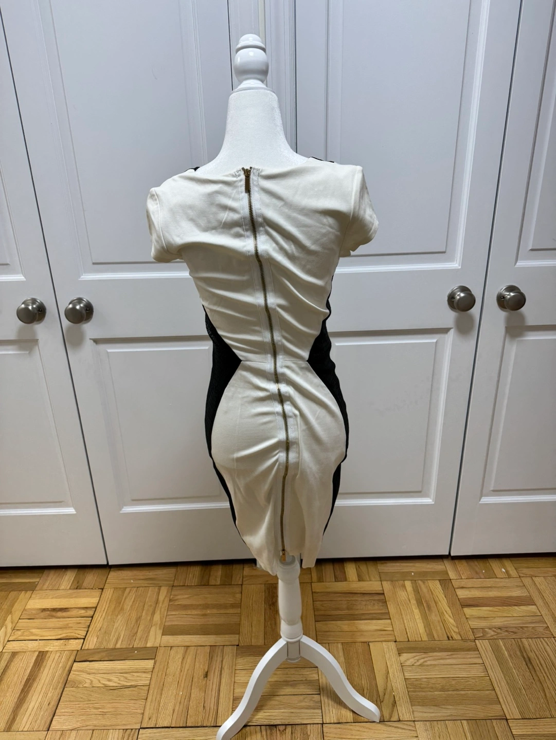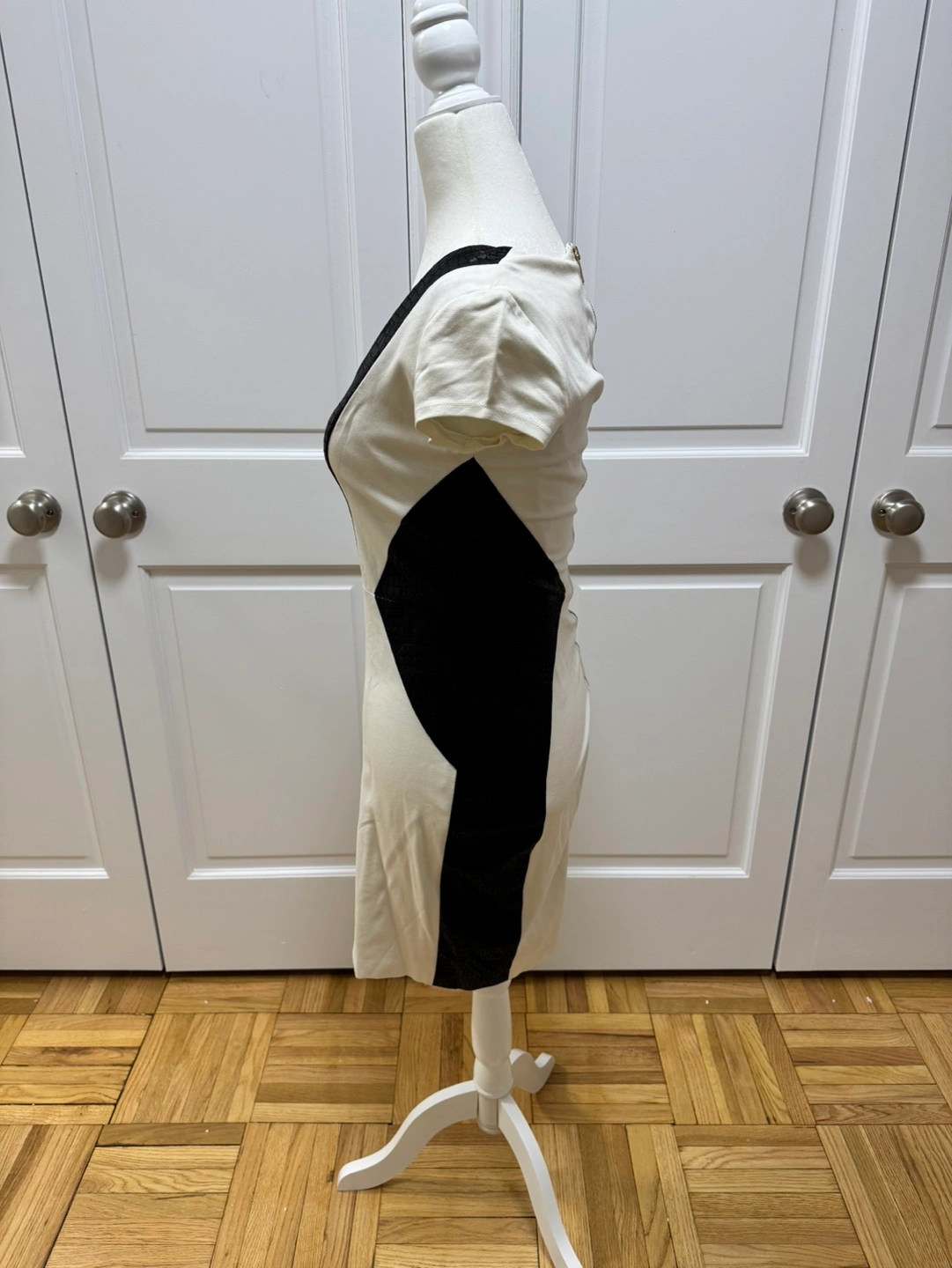Stunning two-tone mini dress. Features a cream bodice and black panels. Short sleeves. Back zipper closure. Size 4. Retails for $200. Pickup is on 72nd and 1st in Manhattan. Preference given to whoever schedules pickup first.