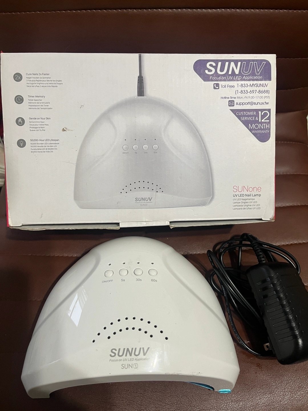 White LED nail lamp. Features timer settings (5, 30, 60 seconds). Includes power adapter.