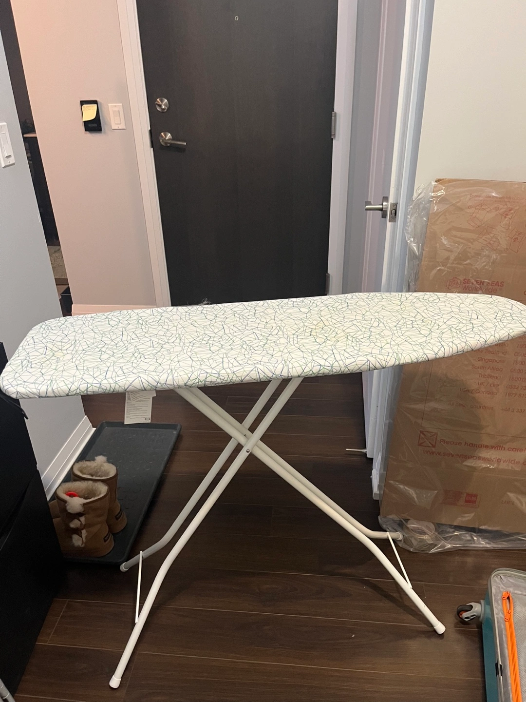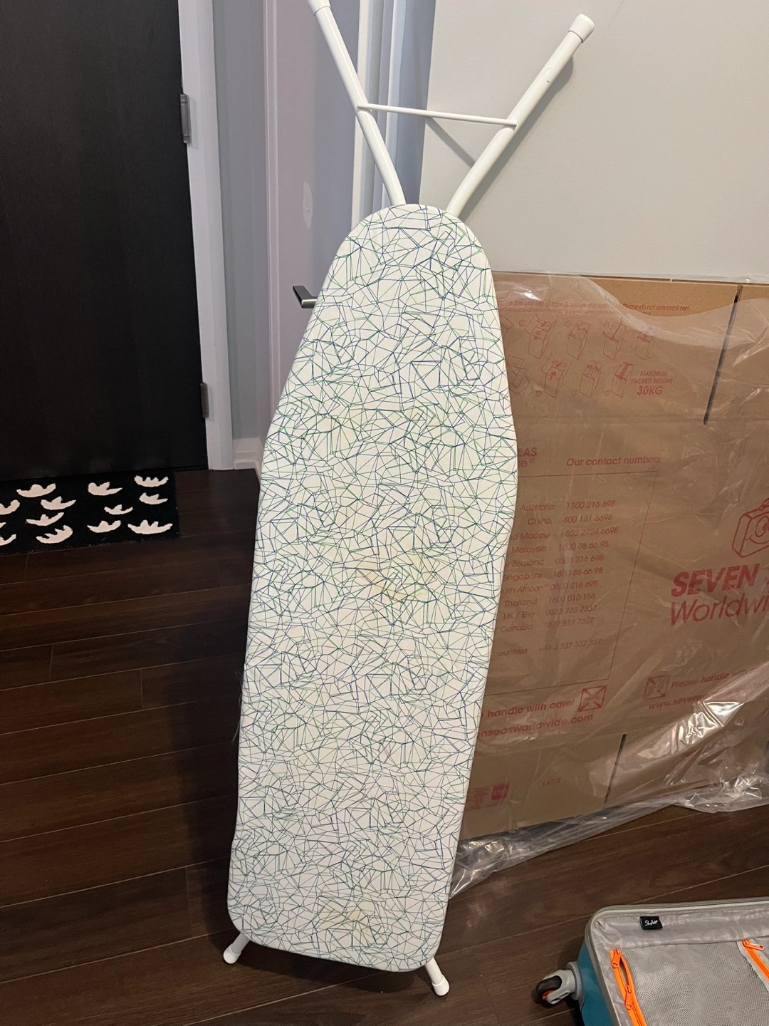 Ironing board, white metal frame. Geometric pattern cover, teal and white. Good used condition. Minor wear.