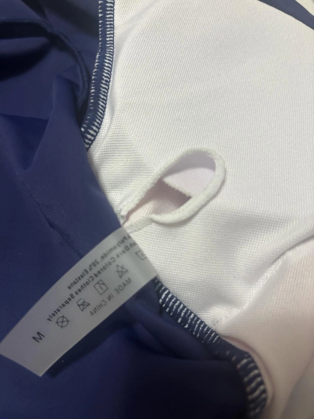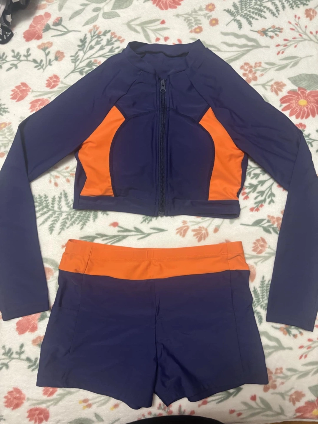 Two-piece swimsuit set. Long-sleeve rash guard top and coordinating shorts. Zipper closure on the top. Navy blue and orange colour block design. Size medium. Never worn. No more tags or plastic on crotch.